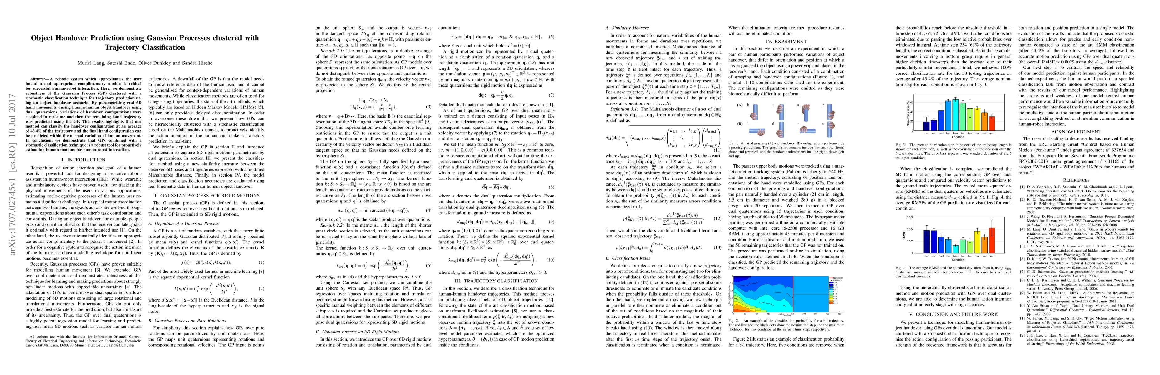 A robotic system which approximates the user intention and appropriate complimentary motion is critical for successful human-robot interaction. %While the existing wearable sensors can monitor human movements in real-time, prediction of human movement is a significant challenge due to its highly non-linear motions optimised through the redundancy in the degrees of freedom. Here, we demonstrate robustness of the Gaussian Process (GP) clustered with a stochastic classification technique for trajectory prediction using an object handover scenario. By parametrising real 6D hand movements during human-human object handover using dual quaternions, variations of handover configurations were classified in real-time and then the remaining hand trajectory was predicted using the GP. The results highlights that our method can classify the handover configuration at an average of $43.4\%$ of the trajectory and the final hand configuration can be predicted within the normal variation of human movement. In conclusion, we demonstrate that GPs combined with a stochastic classification technique is a robust tool for proactively estimating human motions for human-robot interaction.