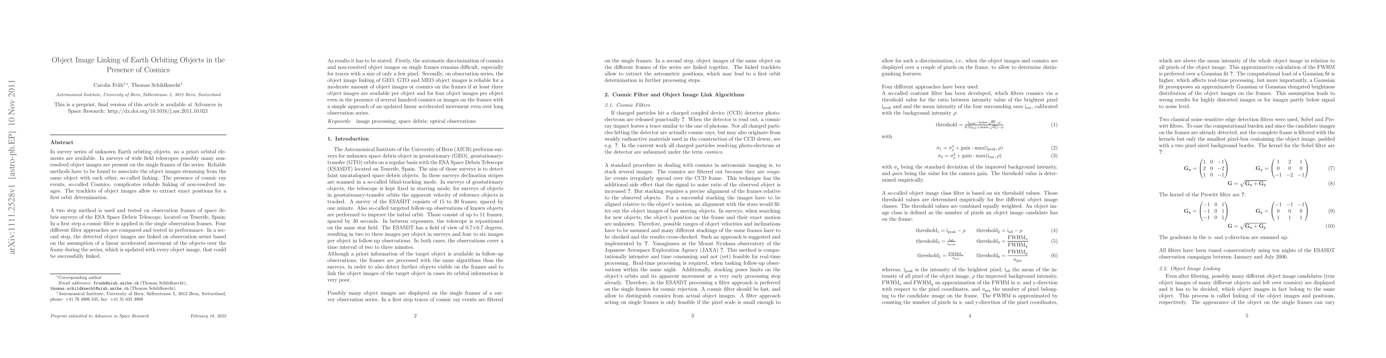 In survey series of unknown Earth orbiting objects, no a priori orbital elements are available. In surveys of wide field telescopes possibly many nonresolved object images are present on the single frames of the series. Reliable methods have to be found to associate the object images stemming from the same object with each other, so-called linking. The presence of cosmic ray events, so-called Cosmics, complicates reliable linking of non-resolved images. The tracklets of object images allow to extract exact positions for a first orbit determination. A two step method is used and tested on observation frames of space debris surveys of the ESA Space Debris Telescope, located on Tenerife, Spain: In a first step a cosmic filter is applied in the single observation frames. Four different filter approaches are compared and tested in performance. In a second step, the detected object images are linked on observation series based on the assumption of a linear accelerated movement of the objects over the frame during the series, which is updated with every object image, that could be successfully linked.