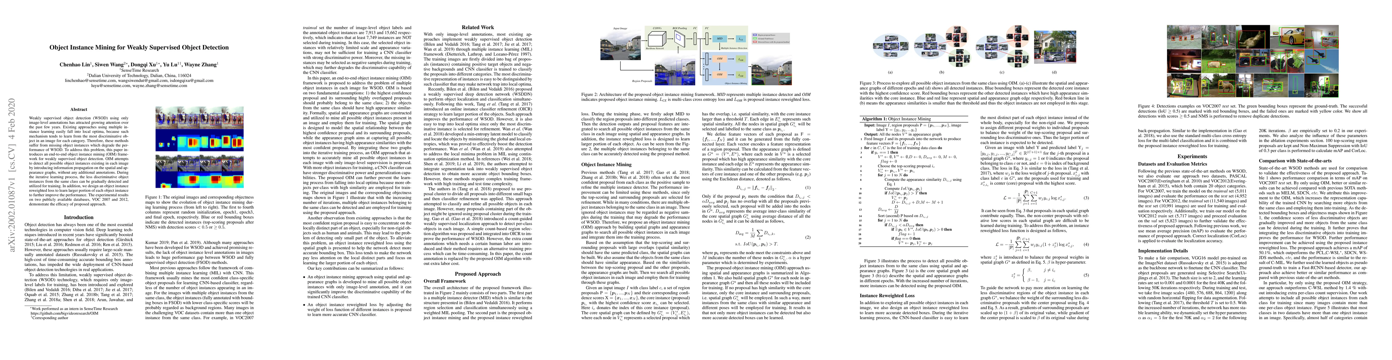 This paper proposes an end-to-end Object Instance Mining (OIM) framework for weakly supervised object detection, addressing the issue of missing instances by utilizing spatial and appearance graph information propagation. The method iteratively detects and trains on less discriminative instances, improving overall detection performance, as demonstrated by results on VOC 2007 and 2012 datasets.