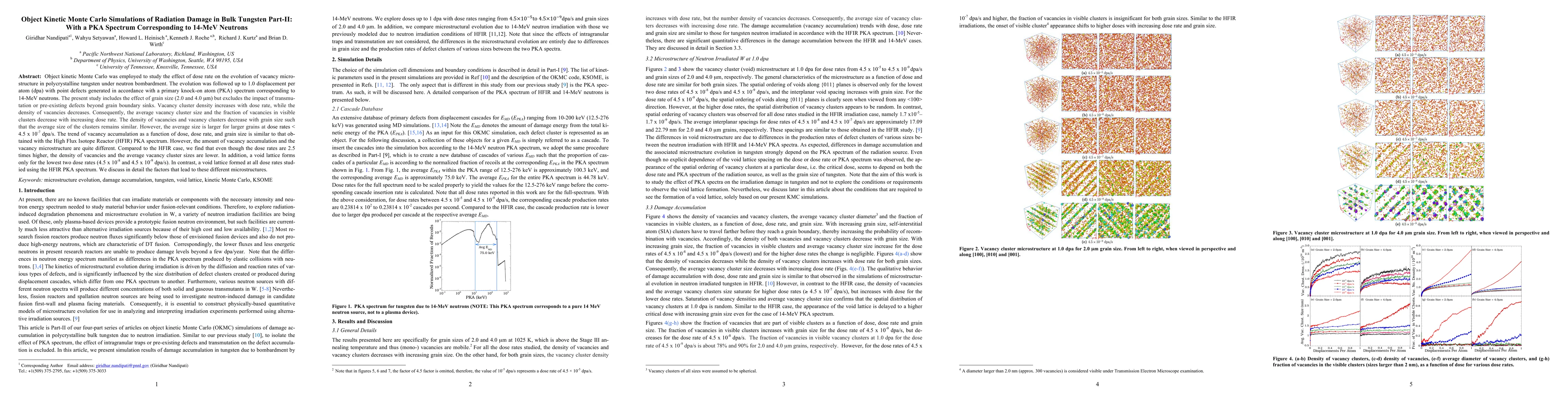 Object kinetic Monte Carlo was employed to study the effect of dose rate on the evolution of vacancy microstructure in polycrystalline tungsten under neutron bombardment. The evolution was followed up to 1.0 displacement per atom (dpa) with point defects generated in accordance with a primary knock-on atom (PKA) spectrum corresponding to 14-MeV neutrons. The present study includes the effect of grain size (2.0 and 4.0 $\mu$m) but excludes the impact of transmutation or pre-existing defects beyond grain boundary sinks. Vacancy cluster density increases with dose rate, while the density of vacancies decreases. Consequently, the average vacancy cluster size and the fraction of vacancies in visible clusters decrease with increasing dose rate. The density of vacancies and vacancy clusters decrease with grain size such that the average size of the clusters remains similar. However, the average size is larger for larger grains at dose rates < 4.5 x 10-7 dpa/s. The trend of vacancy accumulation as a function of dose, dose rate, and grain size is similar to that obtained with the High Flux Isotope Reactor (HFIR) PKA spectrum. However, the amount of vacancy accumulation and the vacancy microstructure are quite different. Compared to the HFIR case, we find that even though the dose rates are 2.5 times higher, the density of vacancies and the average vacancy cluster sizes are lower. In addition, a void lattice forms only for the lowest two dose rates (4.5 x 10-8 and 4.5 x 10-9 dpa/s). In contrast, a void lattice formed at all dose rates studied using the HFIR PKA spectrum. We discuss in detail the factors that lead to these different microstructures.