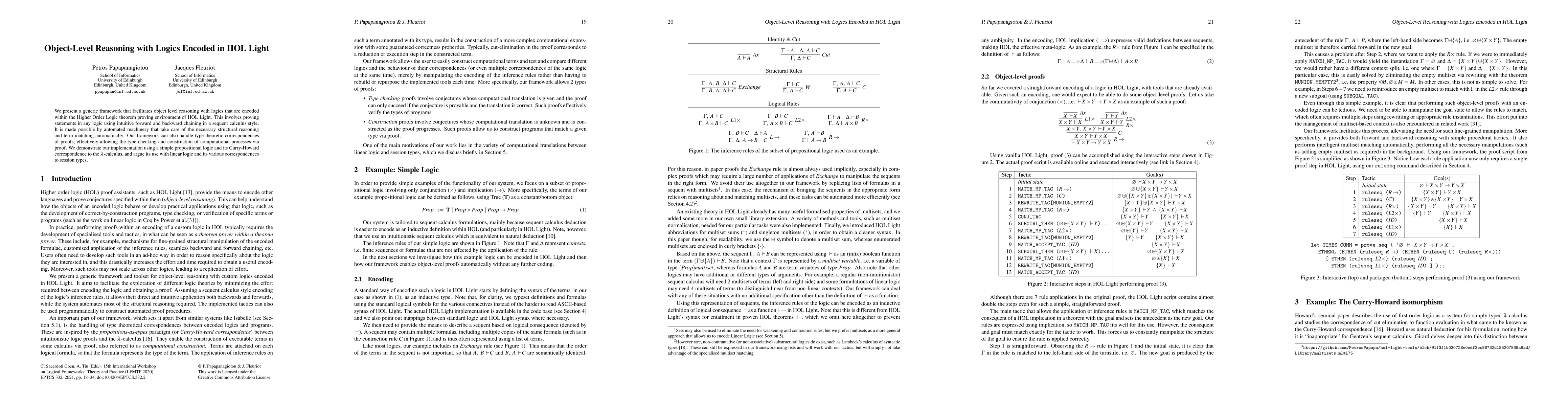 A framework is presented for object-level reasoning using logics encoded in HOL Light, enabling intuitive forward and backward chaining with automated machinery for structural reasoning and term matching. The framework demonstrates applications in propositional logic, linear logic, and its correspondences to lambda-calculus and session types.