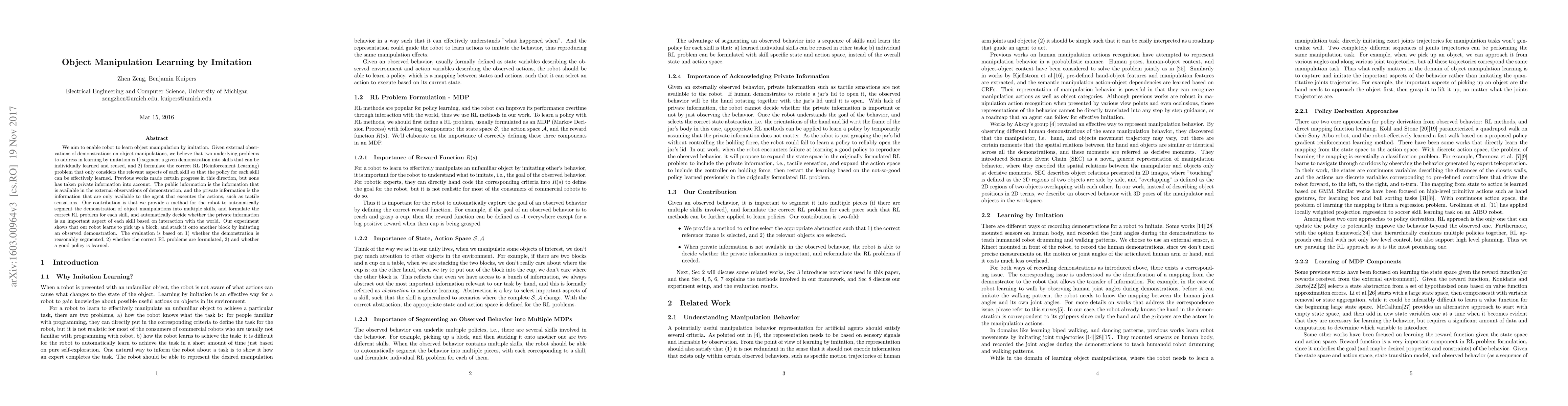 We aim to enable robot to learn object manipulation by imitation. Given external observations of demonstrations on object manipulations, we believe that two underlying problems to address in learning by imitation is 1) segment a given demonstration into skills that can be individually learned and reused, and 2) formulate the correct RL (Reinforcement Learning) problem that only considers the relevant aspects of each skill so that the policy for each skill can be effectively learned. Previous works made certain progress in this direction, but none has taken private information into account. The public information is the information that is available in the external observations of demonstration, and the private information is the information that are only available to the agent that executes the actions, such as tactile sensations. Our contribution is that we provide a method for the robot to automatically segment the demonstration of object manipulations into multiple skills, and formulate the correct RL problem for each skill, and automatically decide whether the private information is an important aspect of each skill based on interaction with the world. Our experiment shows that our robot learns to pick up a block, and stack it onto another block by imitating an observed demonstration. The evaluation is based on 1) whether the demonstration is reasonably segmented, 2) whether the correct RL problems are formulated, 3) and whether a good policy is learned.