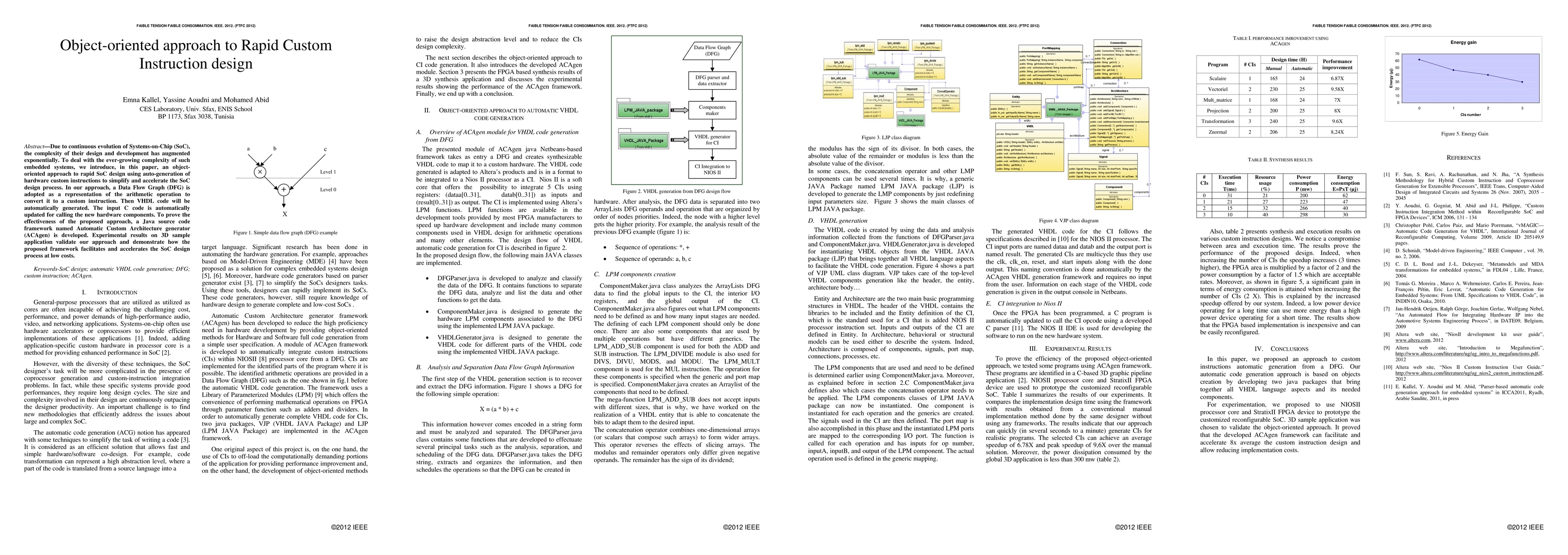 This paper proposes an object-oriented method for rapid SoC design using auto-generated hardware custom instructions. The approach employs a Data Flow Graph to convert arithmetic operations into custom instructions, automatically generating VHDL code and updating input C code, validated by a framework named ACAgen on a 3D sample application.