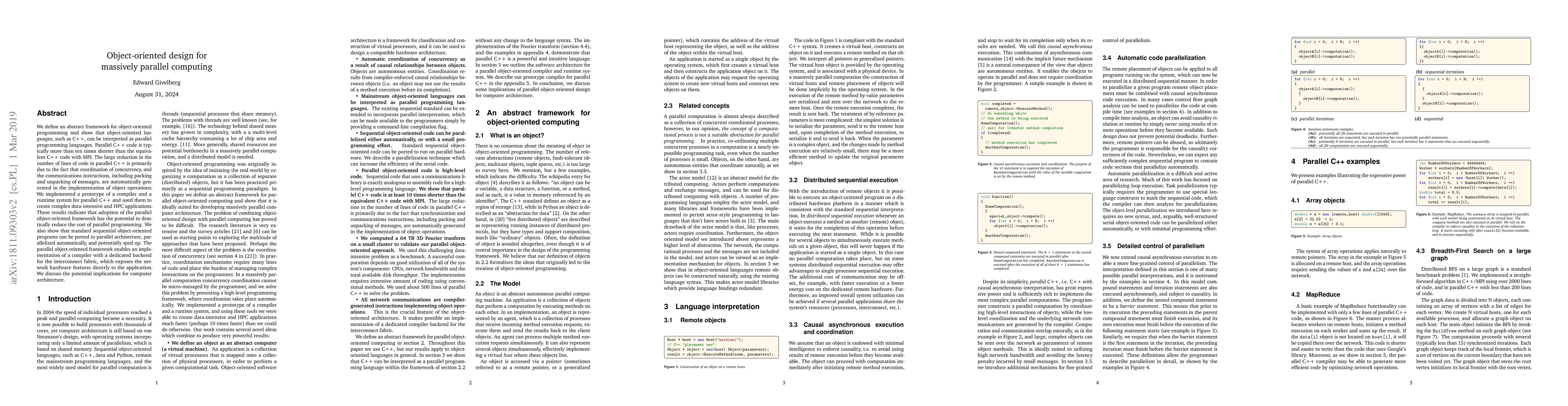 We define an abstract framework for object-oriented programming and show that object-oriented languages, such as C++, can be interpreted as parallel programming languages. Parallel C++ code is typically more than ten times shorter than the equivalent C++ code with MPI. The large reduction in the number of lines of code in parallel C++ is primarily due to the fact that coordination of concurrency, and the communications instructions, including packing and unpacking of messages, are automatically generated in the implementation of object operations. We implemented a prototype of a compiler and a runtime system for parallel C++ and used them to create complex data-intensive and HPC applications. These results indicate that adoption of the parallel object-oriented framework has the potential to drastically reduce the cost of parallel programming. We also show that standard sequential object-oriented programs can be ported to parallel architecture, parallelized automatically, and potentially sped up. The parallel object-oriented framework enables an implementation of a compiler with a dedicated backend for the interconnect fabric, which exposes the network hardware features directly to the application. We discuss the potential implications for computer architecture.