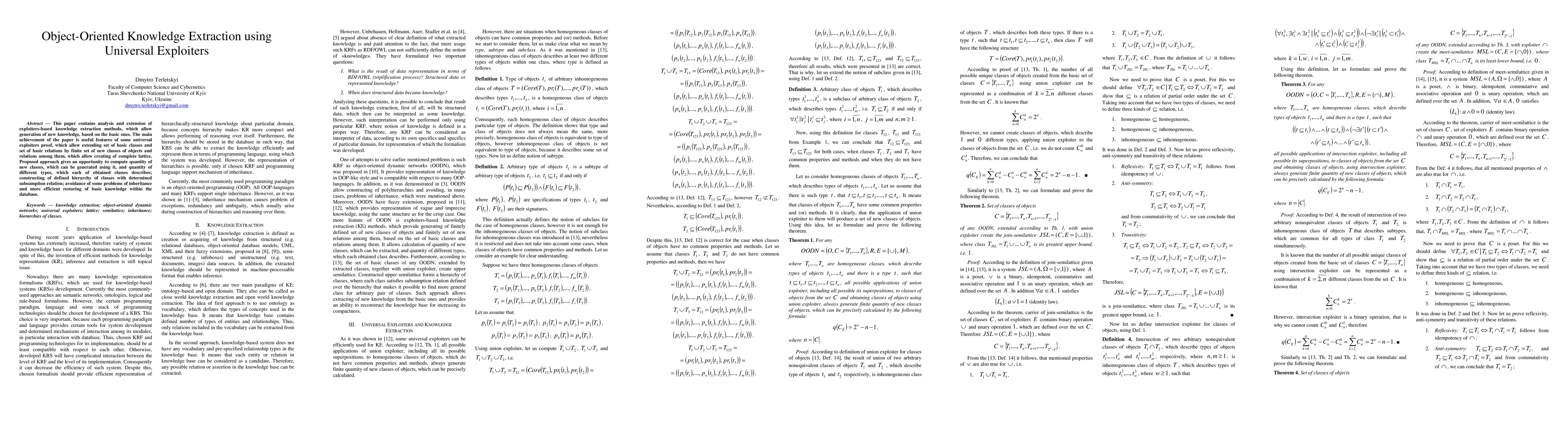 This paper proposes a method for object-oriented knowledge extraction using universal exploiters, demonstrating how finite sets of new classes and relations can extend basic knowledge structures. It also outlines the ability to compute new class quantities, construct class hierarchies, and improve knowledge restoration efficiency.