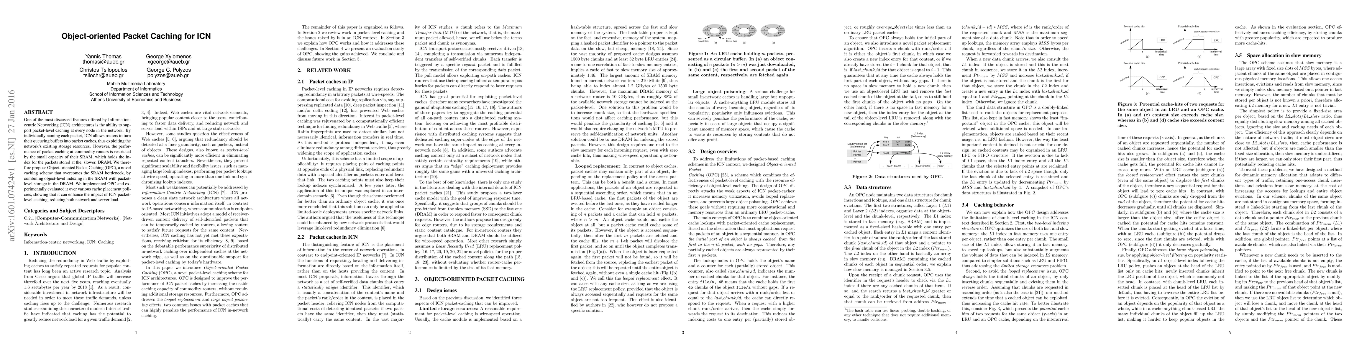 Title: Object-oriented Packet Caching for ICN Summary: This paper proposes Object-oriented Packet Caching (OPC) to enhance packet-level caching in ICN by leveraging object-level indexing in SRAM and packet-level storage in DRAM, thereby overcoming the SRAM bottleneck and improving network and server load reduction.