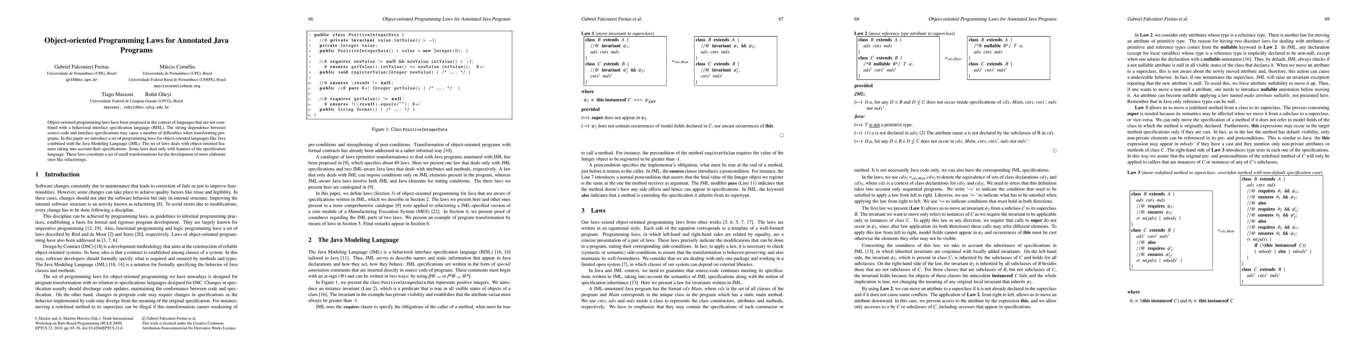 This paper introduces programming laws for object-oriented Java programs annotated with Java Modeling Language (JML) specifications, addressing the complexities arising from the interdependence of source code and interface specifications. These laws facilitate smaller transformations, paving the way for more complex operations like refactoring.