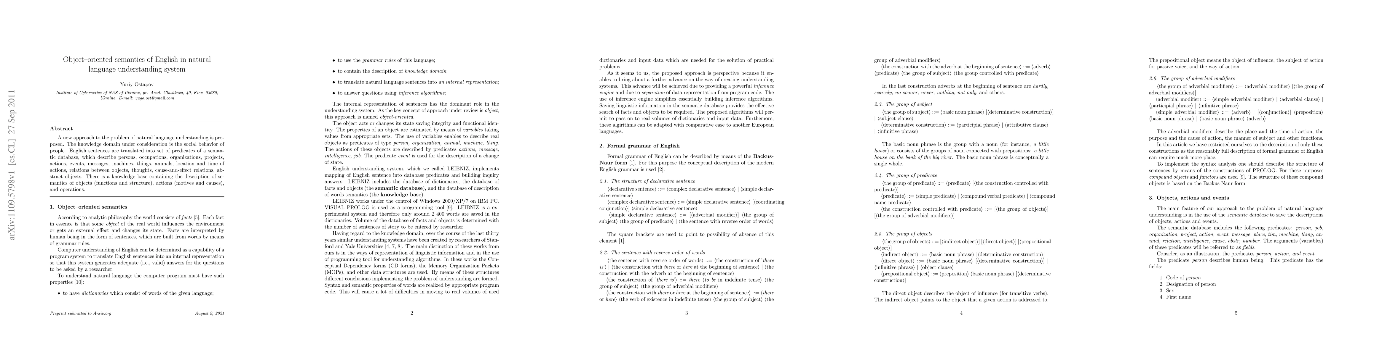 A new approach to the problem of natural language understanding is proposed. The knowledge domain under consideration is the social behavior of people. English sentences are translated into set of predicates of a semantic database, which describe persons, occupations, organizations, projects, actions, events, messages, machines, things, animals, location and time of actions, relations between objects, thoughts, cause-and-effect relations, abstract objects. There is a knowledge base containing the description of semantics of objects (functions and structure), actions (motives and causes), and operations.