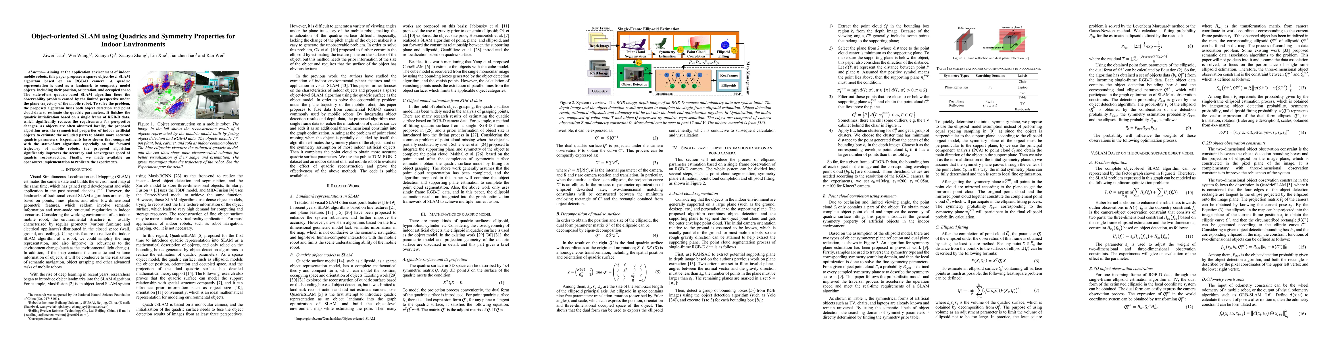 This paper proposes a sparse object-level SLAM algorithm for indoor mobile robots using quadrics and symmetry properties. It leverages RGB-D data to initialize quadrics from single frames, improving observability and accuracy by estimating occluded parts through object symmetry.