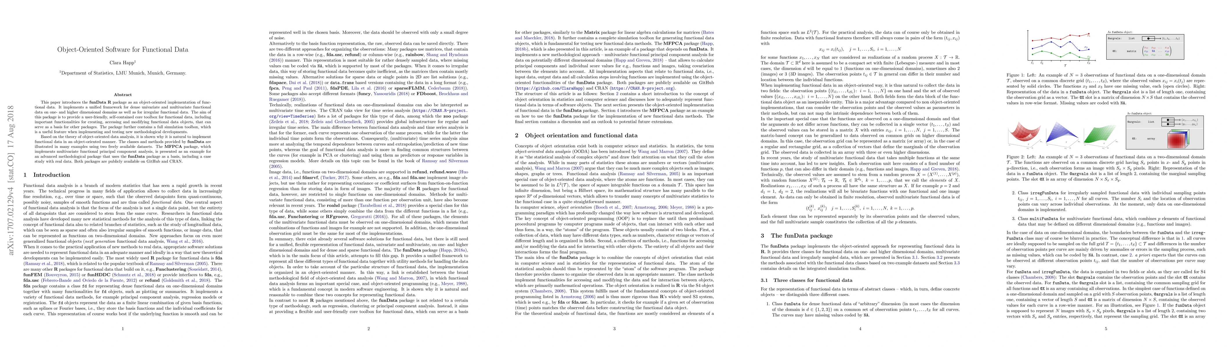 This paper introduces the funData R package, an object-oriented framework for functional data analysis, providing tools for creating and manipulating functional data objects and a simulation toolbox for methodological development. It serves as a foundation for other packages, exemplified by the MFPCA package for multivariate functional principal component analysis.