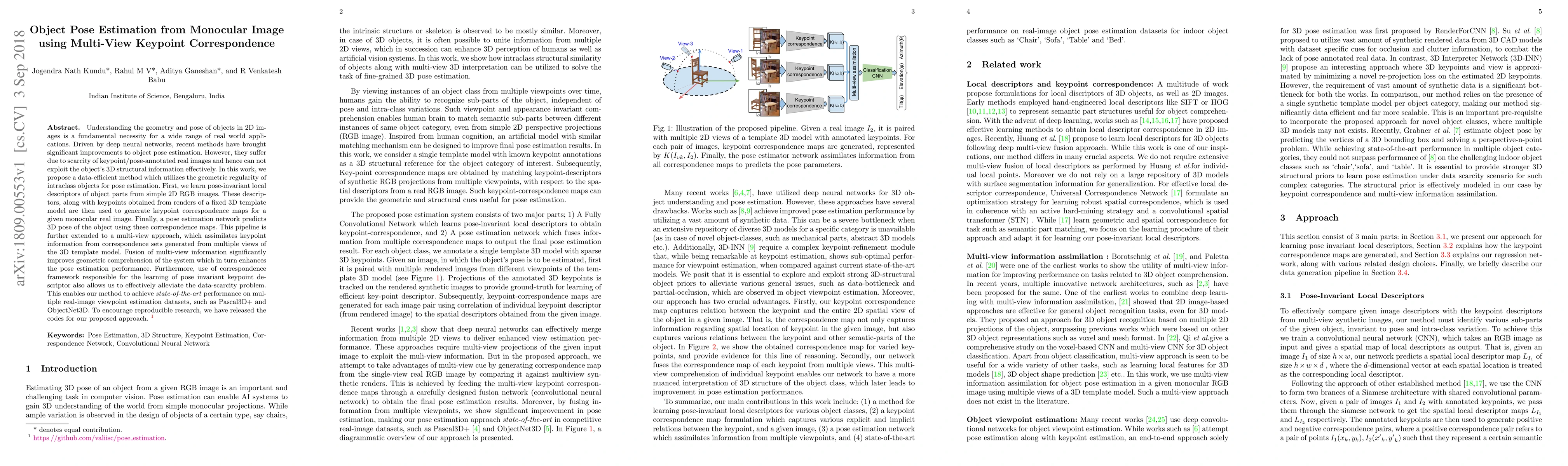 This paper proposes a data-efficient method for monocular object pose estimation using multi-view keypoint correspondence. It leverages pose-invariant local descriptors from 2D images and 3D template models to generate correspondence maps, which enhance pose estimation performance and address data scarcity issues.
