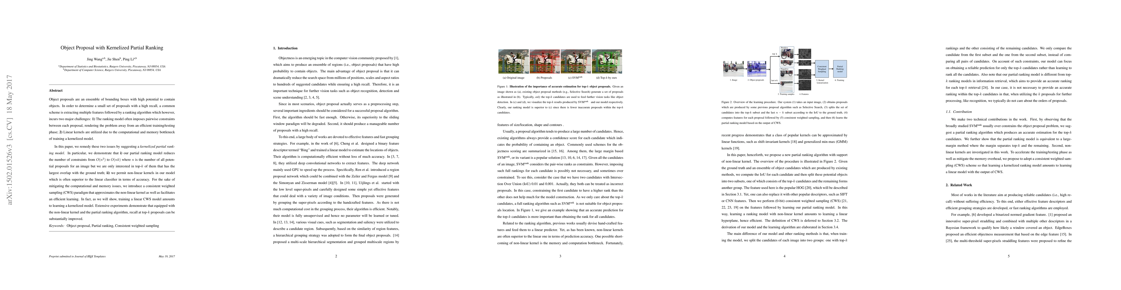 Object proposals are an ensemble of bounding boxes with high potential to contain objects. In order to determine a small set of proposals with a high recall, a common scheme is extracting multiple features followed by a ranking algorithm which however, incurs two major challenges: {\bf 1)} The ranking model often imposes pairwise constraints between each proposal, rendering the problem away from an efficient training/testing phase; {\bf 2)} Linear kernels are utilized due to the computational and memory bottleneck of training a kernelized model. In this paper, we remedy these two issues by suggesting a {\em kernelized partial ranking model}. In particular, we demonstrate that {\bf i)} our partial ranking model reduces the number of constraints from $O(n^2)$ to $O(nk)$ where $n$ is the number of all potential proposals for an image but we are only interested in top-$k$ of them that has the largest overlap with the ground truth; {\bf ii)} we permit non-linear kernels in our model which is often superior to the linear classifier in terms of accuracy. For the sake of mitigating the computational and memory issues, we introduce a consistent weighted sampling~(CWS) paradigm that approximates the non-linear kernel as well as facilitates an efficient learning. In fact, as we will show, training a linear CWS model amounts to learning a kernelized model. Extensive experiments demonstrate that equipped with the non-linear kernel and the partial ranking algorithm, recall at top-$k$ proposals can be substantially improved.