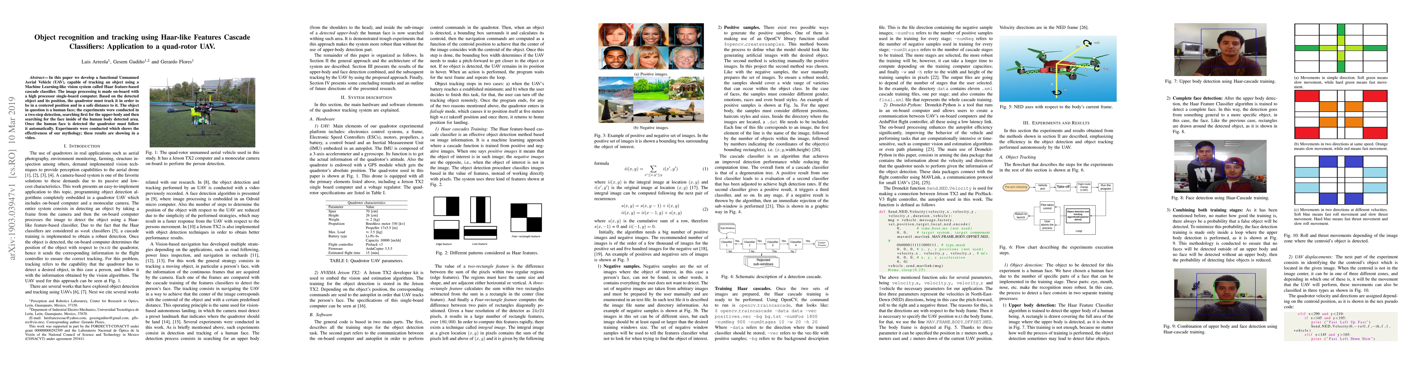 In this paper, we develop a functional Unmanned Aerial Vehicle (UAV), capable of tracking an object using a Machine Learning-like vision system called Haar feature-based cascade classifier. The image processing is made on-board with a high processor single-board computer. Based on the detected object and its position, the quadrotor must track it in order to be in a centered position and in a safe distance to it. The object in question is a human face; the experiments were conducted in a two-step detection, searching first for the upper-body and then searching for the face inside of the human body detected area. Once the human face is detected the quadrotor must follow it automatically. Experiments were conducted which shows the effectiveness of our mythology; these results are showing in a video.