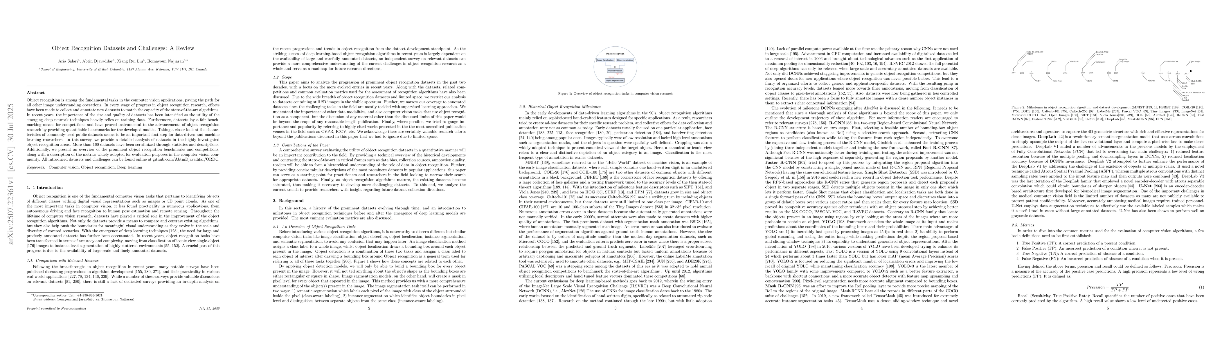 The paper provides a comprehensive review of object recognition datasets and challenges, analyzing over 160 datasets and presenting an overview of benchmarks and competitions.