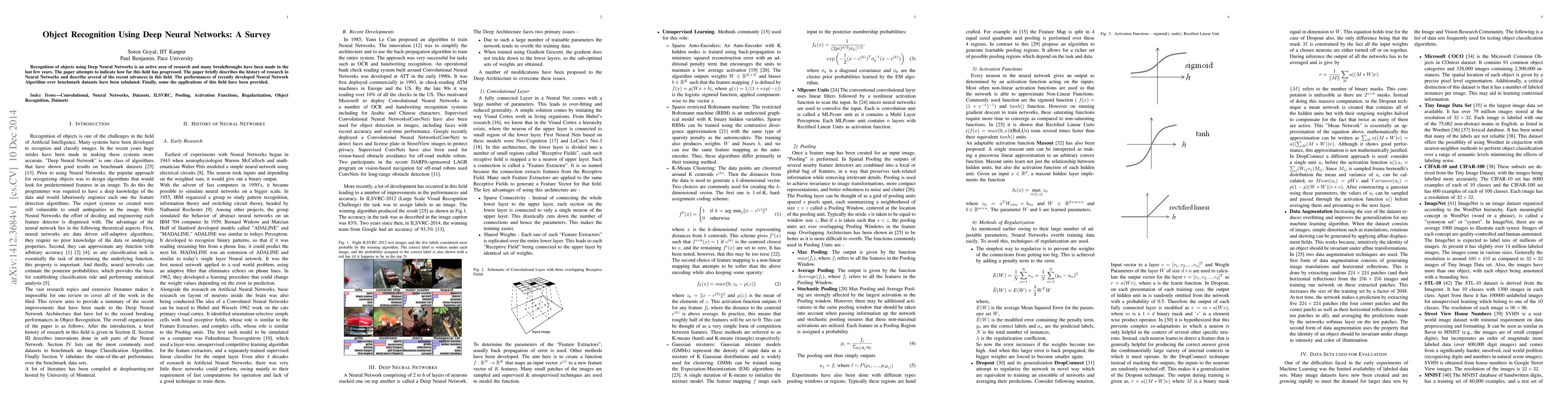 Recognition of objects using Deep Neural Networks is an active area of research and many breakthroughs have been made in the last few years. The paper attempts to indicate how far this field has progressed. The paper briefly describes the history of research in Neural Networks and describe several of the recent advances in this field. The performances of recently developed Neural Network Algorithm over benchmark datasets have been tabulated. Finally, some the applications of this field have been provided.
