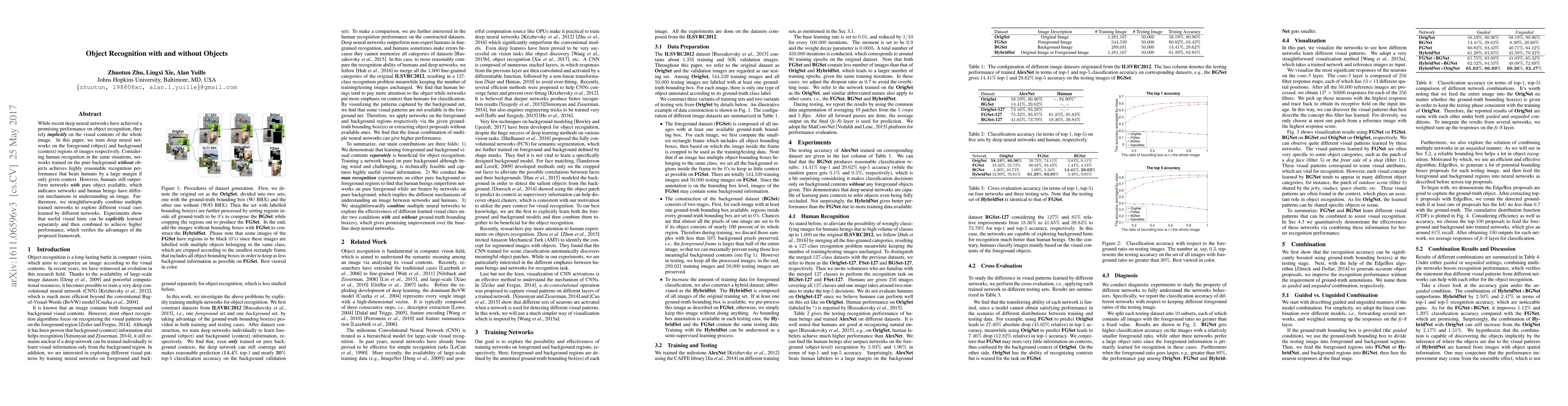 While recent deep neural networks have achieved a promising performance on object recognition, they rely implicitly on the visual contents of the whole image. In this paper, we train deep neural net- works on the foreground (object) and background (context) regions of images respectively. Consider- ing human recognition in the same situations, net- works trained on the pure background without ob- jects achieves highly reasonable recognition performance that beats humans by a large margin if only given context. However, humans still outperform networks with pure object available, which indicates networks and human beings have different mechanisms in understanding an image. Furthermore, we straightforwardly combine multiple trained networks to explore different visual cues learned by different networks. Experiments show that useful visual hints can be explicitly learned separately and then combined to achieve higher performance, which verifies the advantages of the proposed framework.