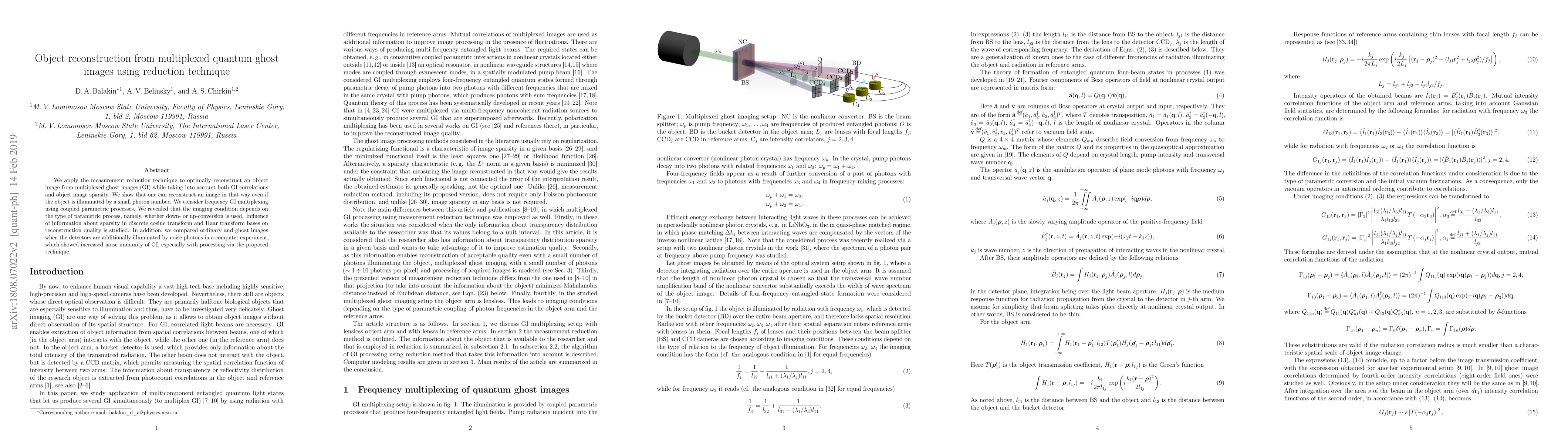 We apply the measurement reduction technique to optimally reconstruct an object image from multiplexed ghost images (GI) while taking into account both GI correlations and object image sparsity. We show that one can reconstruct an image in that way even if the object is illuminated by a small photon number. We consider frequency GI multiplexing using coupled parametric processes. We revealed that the imaging condition depends on the type of parametric process, namely, whether down- or up-conversion is used. Influence of information about sparsity in discrete cosine transform and Haar transform bases on reconstruction quality is studied. In addition, we compared ordinary and ghost images when the detectors are additionally illuminated by noise photons in a computer experiment, which showed increased noise immunity of GI, especially with processing via the proposed technique.