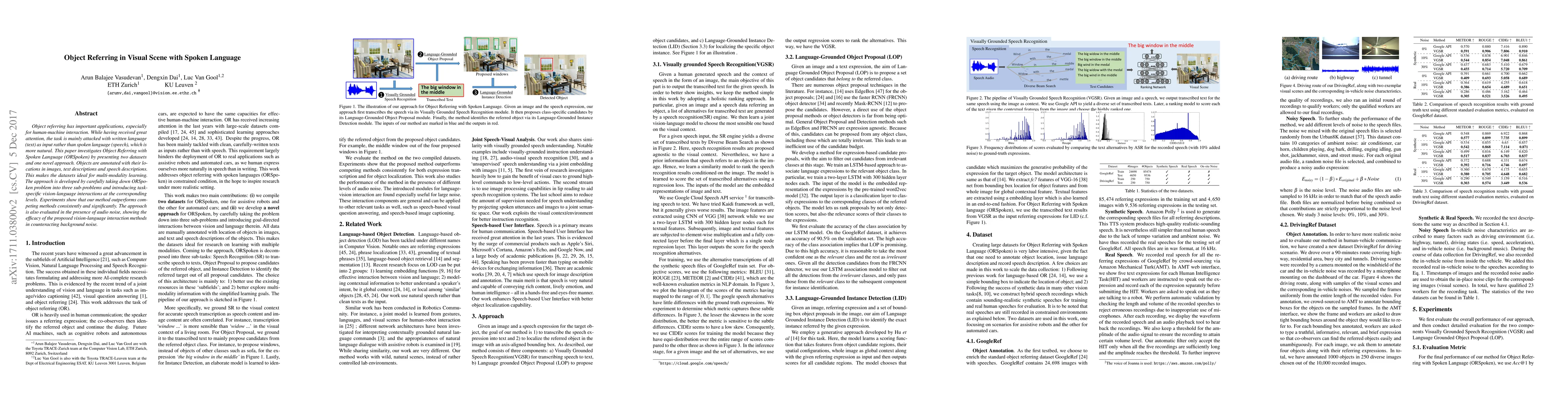 This paper introduces Object Referring with Spoken Language (ORSpoken) and presents two annotated datasets for multi-modality learning, along with a novel approach that breaks down the task into three sub-problems with vision-language interactions. The proposed method outperforms existing methods and demonstrates robustness against audio noise.