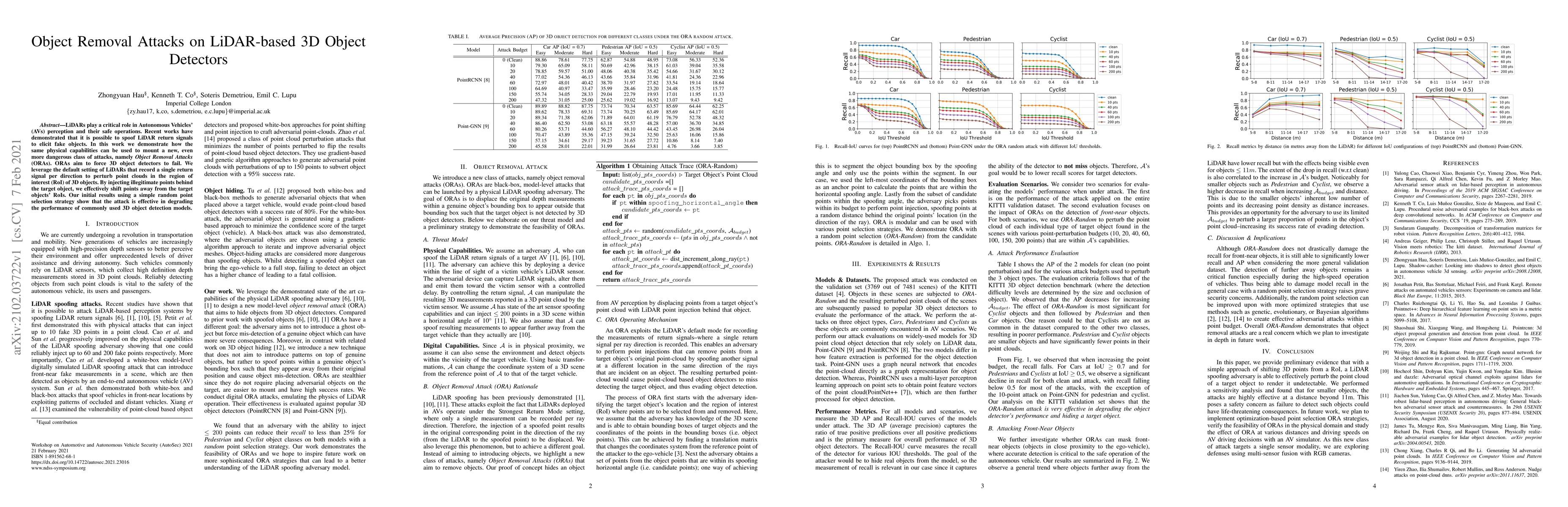This paper explores Object Removal Attacks (ORAs) on LiDAR-based 3D object detectors used in autonomous vehicles, demonstrating how to manipulate LiDAR signals to obscure objects, thereby degrading detection performance. Initial results show that injecting illegitimate points behind target objects can effectively disrupt detection models.