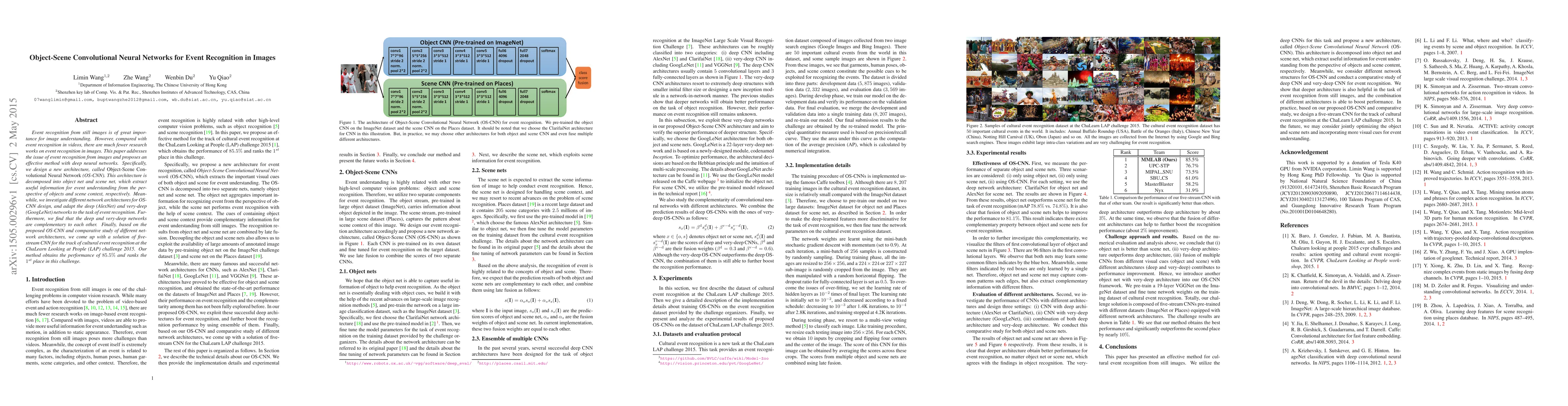 This paper proposes an Object-Scene Convolutional Neural Network (OS-CNN) for event recognition in still images, combining object and scene context information. The method achieves top performance in the ChaLearn Looking at People 2015 challenge with an 85.5% accuracy.
