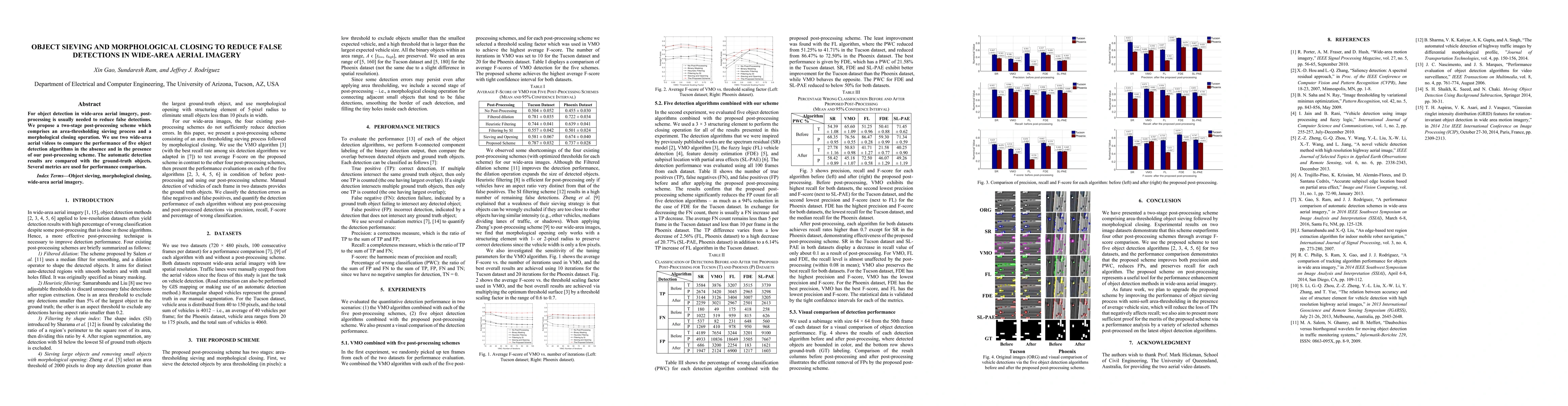 This paper proposes a two-stage post-processing method—object sieving and morphological closing—to reduce false detections in wide-area aerial imagery. The method is evaluated using two aerial videos and five object detection algorithms, showing improved performance metrics compared to ground-truth data.