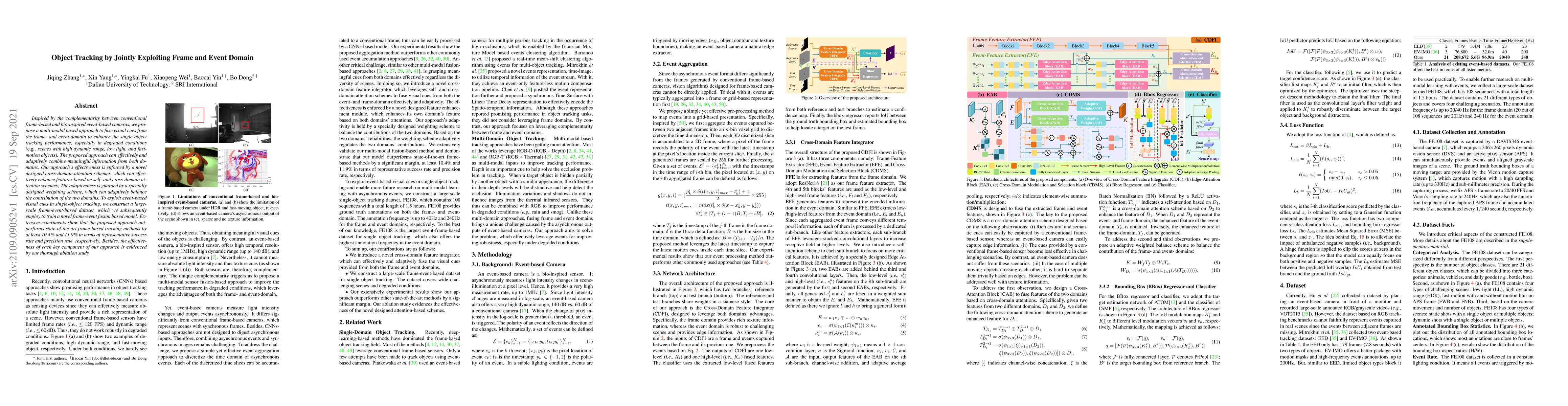 This paper proposes a multi-modal approach to enhance single object tracking by fusing visual cues from frame-based and event-based cameras, achieving superior performance in degraded conditions. The method employs cross-domain attention and adaptive weighting schemes, and is validated with a new frame-event dataset, outperforming existing frame-based tracking methods significantly.