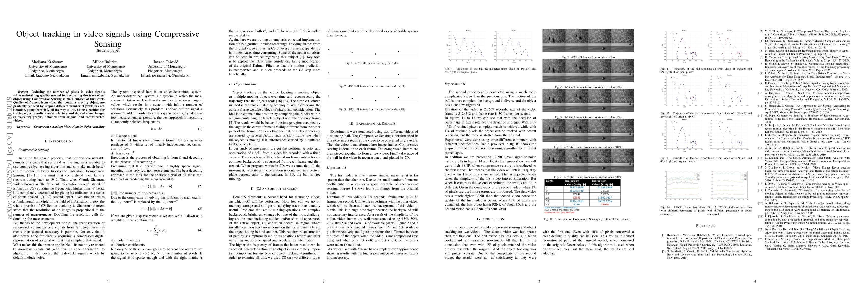 This paper explores object tracking in video signals using Compressive Sensing to reduce pixel count while maintaining quality. Results show satisfactory object tracing with minimal changes in trajectory graphs, even at low pixel retention levels.