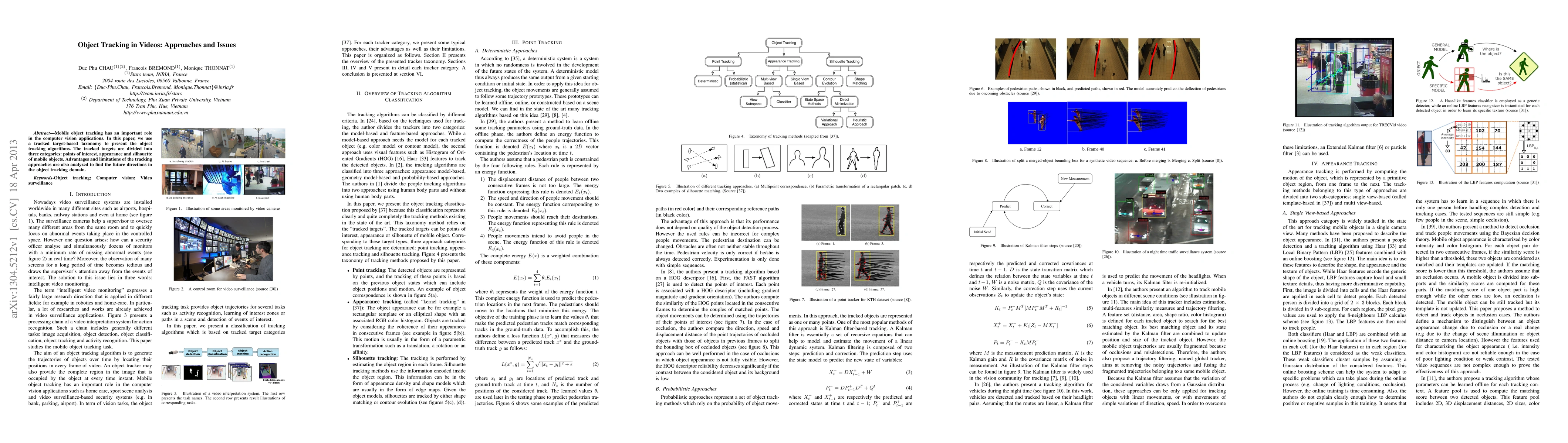 Mobile object tracking has an important role in the computer vision applications. In this paper, we use a tracked target-based taxonomy to present the object tracking algorithms. The tracked targets are divided into three categories: points of interest, appearance and silhouette of mobile objects. Advantages and limitations of the tracking approaches are also analyzed to find the future directions in the object tracking domain.