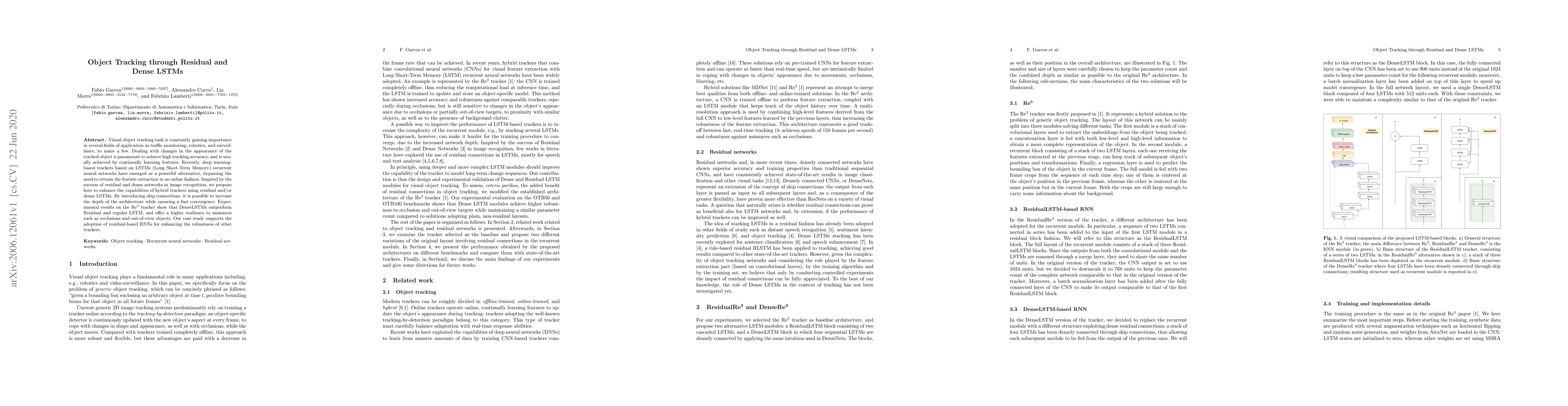 This paper proposes using residual and dense LSTMs to improve object tracking accuracy by introducing skip connections, leading to faster convergence and better resilience to occlusions and out-of-view objects.