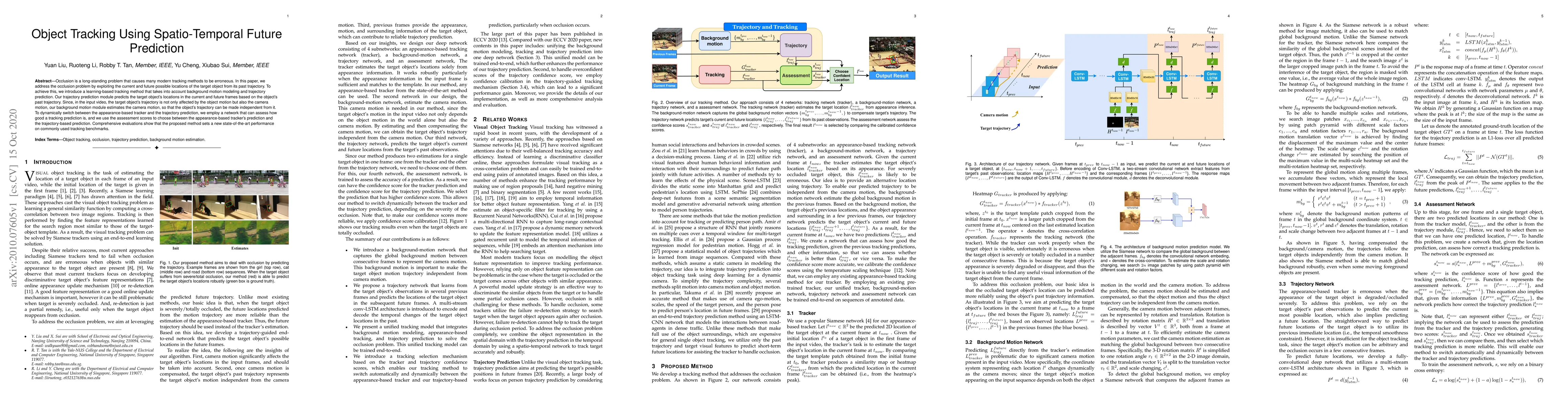 This paper proposes a learning-based object tracking method that uses spatio-temporal future prediction to address occlusion issues by modeling background motion and predicting future object locations based on past trajectories. The method dynamically switches between appearance-based tracking and trajectory prediction, achieving state-of-the-art performance on tracking benchmarks.