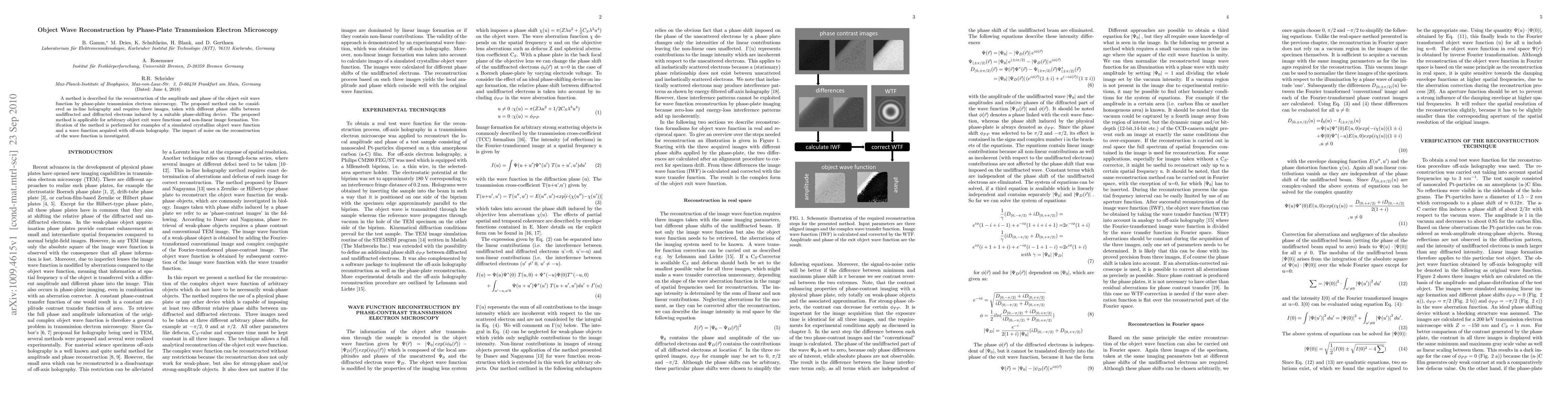 A method is described for the reconstruction of the amplitude and phase of the object exit wave function by phase-plate transmission electron microscopy. The proposed method can be considered as in-line holography and requires three images, taken with different phase shifts between undiffracted and diffracted electrons induced by a suitable phase-shifting device. The proposed method is applicable for arbitrary object exit wave functions and non-linear image formation. Verification of the method is performed for examples of a simulated crystalline object wave function and a wave function acquired with off-axis holography. The impact of noise on the reconstruction of the wave function is investigated.