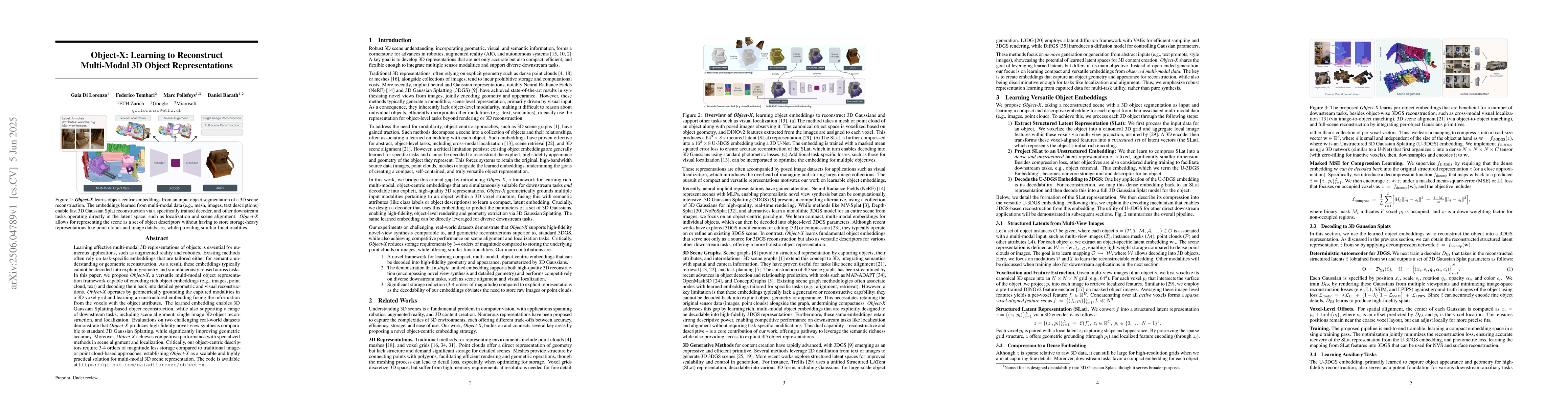 Object-X proposes a multi-modal object representation framework that encodes rich object embeddings (images, point clouds, text) into a 3D voxel grid, learning an unstructured embedding fusing voxel information with object attributes. This enables 3D Gaussian Splatting-based reconstruction and supports various downstream tasks.
