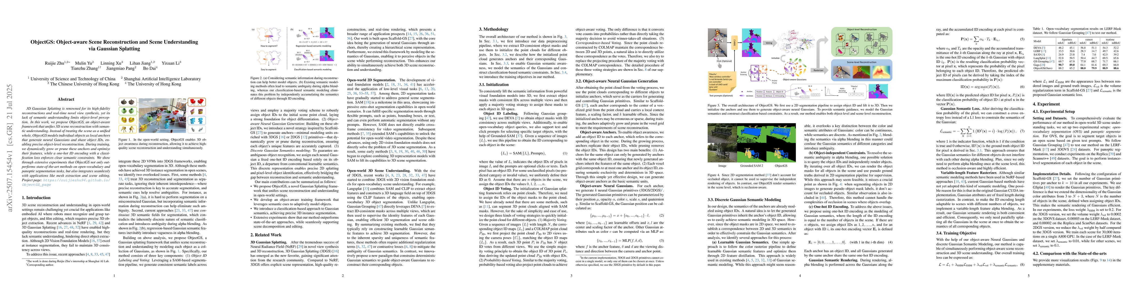 3D Gaussian Splatting is renowned for its high-fidelity reconstructions and real-time novel view synthesis, yet its lack of semantic understanding limits object-level perception. In this work, we propose ObjectGS, an object-aware framework that unifies 3D scene reconstruction with semantic understanding. Instead of treating the scene as a unified whole, ObjectGS models individual objects as local anchors that generate neural Gaussians and share object IDs, enabling precise object-level reconstruction. During training, we dynamically grow or prune these anchors and optimize their features, while a one-hot ID encoding with a classification loss enforces clear semantic constraints. We show through extensive experiments that ObjectGS not only outperforms state-of-the-art methods on open-vocabulary and panoptic segmentation tasks, but also integrates seamlessly with applications like mesh extraction and scene editing. Project page: https://ruijiezhu94.github.io/ObjectGS_page