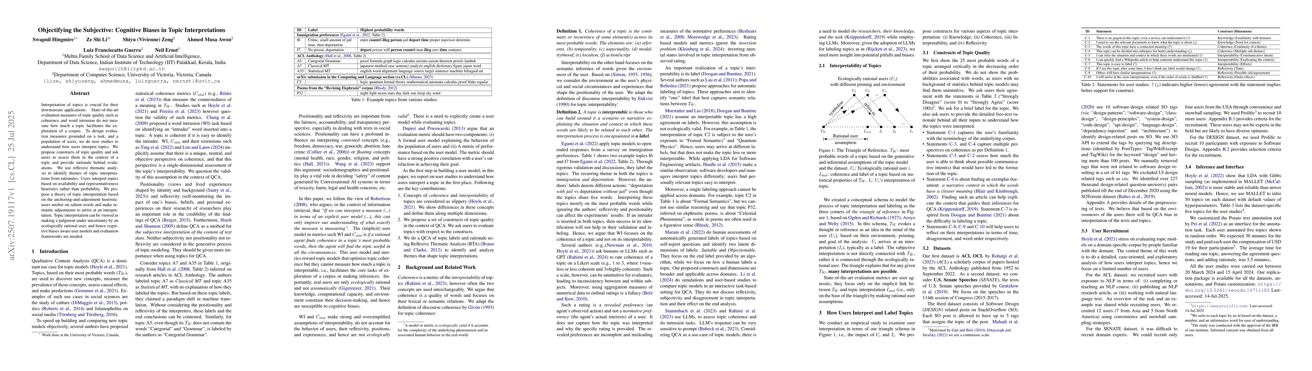 Interpretation of topics is crucial for their downstream applications. State-of-the-art evaluation measures of topic quality such as coherence and word intrusion do not measure how much a topic facilitates the exploration of a corpus. To design evaluation measures grounded on a task, and a population of users, we do user studies to understand how users interpret topics. We propose constructs of topic quality and ask users to assess them in the context of a topic and provide rationale behind evaluations. We use reflexive thematic analysis to identify themes of topic interpretations from rationales. Users interpret topics based on availability and representativeness heuristics rather than probability. We propose a theory of topic interpretation based on the anchoring-and-adjustment heuristic: users anchor on salient words and make semantic adjustments to arrive at an interpretation. Topic interpretation can be viewed as making a judgment under uncertainty by an ecologically rational user, and hence cognitive biases aware user models and evaluation frameworks are needed.