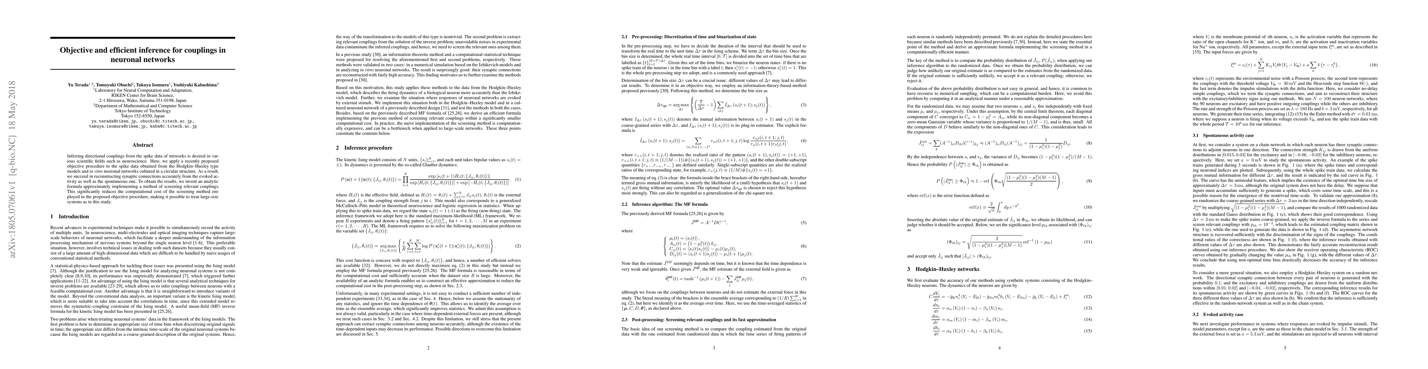 Inferring directional couplings from the spike data of networks is desired in various scientific fields such as neuroscience. Here, we apply a recently proposed objective procedure to the spike data obtained from the Hodgkin--Huxley type models and in vitro neuronal networks cultured in a circular structure. As a result, we succeed in reconstructing synaptic connections accurately from the evoked activity as well as the spontaneous one. To obtain the results, we invent an analytic formula approximately implementing a method of screening relevant couplings. This significantly reduces the computational cost of the screening method employed in the proposed objective procedure, making it possible to treat large-size systems as in this study.