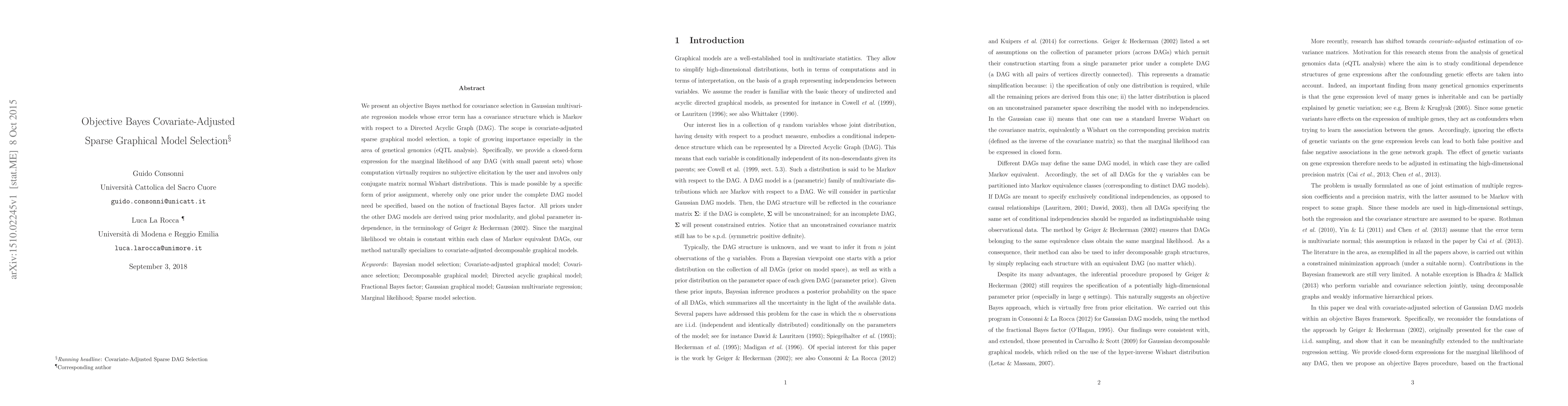 This paper introduces an objective Bayes method for selecting covariate-adjusted sparse graphical models in Gaussian multivariate regression, utilizing a closed-form expression for the marginal likelihood that requires no subjective input from the user. The method is particularly relevant for genetical genomics, simplifying the analysis of eQTLs through Markovian DAG structures.