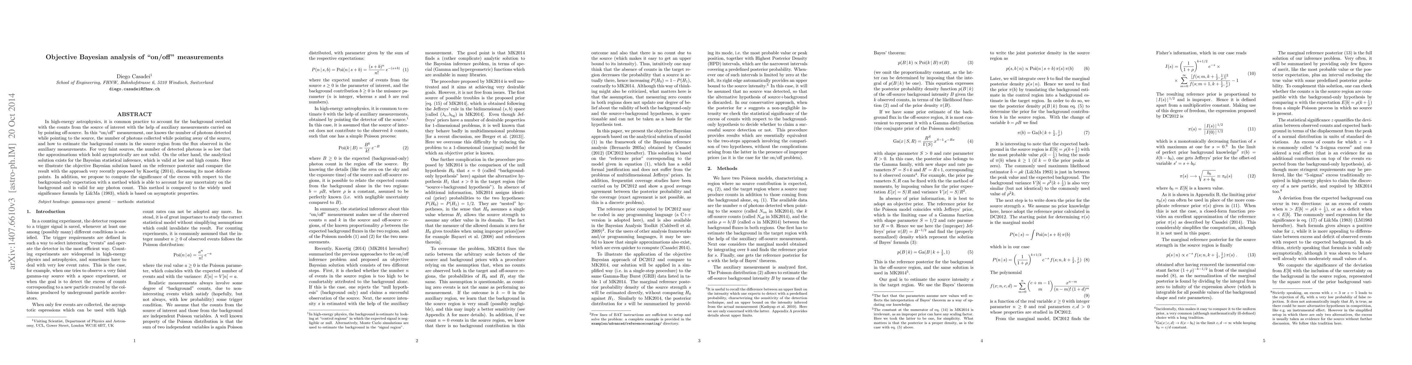 In high-energy astrophysics, it is common practice to account for the background overlaid with the counts from the source of interest with the help of auxiliary measurements carried on by pointing off-source. In this "on/off" measurement, one knows the number of photons detected while pointing to the source, the number of photons collected while pointing away of the source, and how to estimate the background counts in the source region from the flux observed in the auxiliary measurements. For very faint sources, the number of detected photons is so low that the approximations which hold asymptotically are not valid. On the other hand, the analytical solution exists for the Bayesian statistical inference, which is valid at low and high counts. Here we illustrate the objective Bayesian solution based on the reference posterior and compare the result with the approach very recently proposed by \citet{knoetig2014}, discussing its most delicate points. In addition, we propose to compute the significance of the excess with respect to the background-only expectation with a method which is able to account for any uncertainty on the background and is valid for any photon count. This method is compared to the widely used significance formula by \citet{LiMa83}, which is based on asymptotic properties.