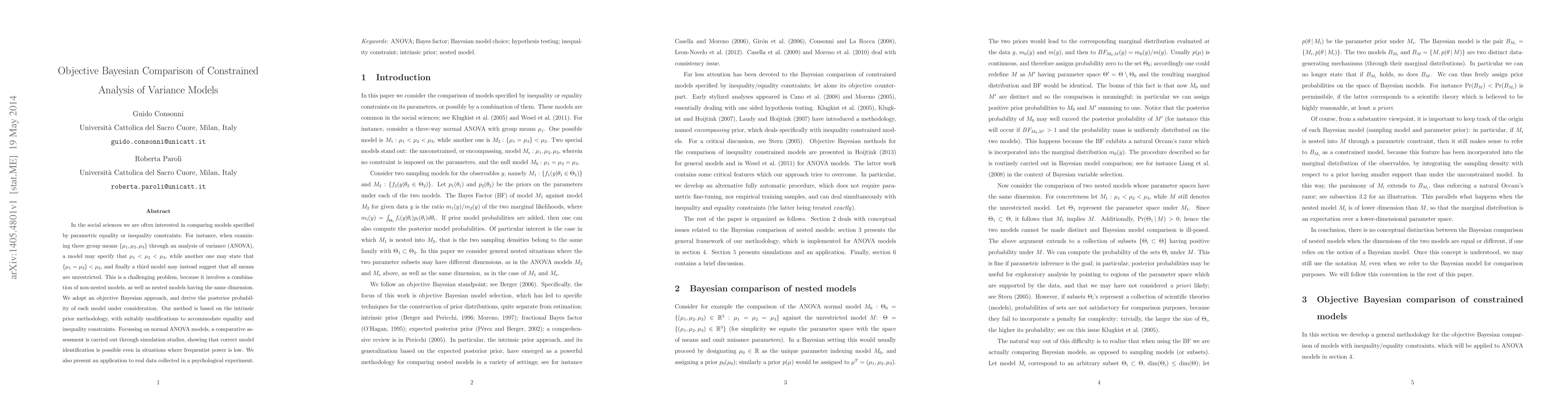 This paper presents an objective Bayesian approach to comparing constrained ANOVA models, showing that correct model identification is possible even with low frequentist power, and applies the method to real data in a psychological experiment.