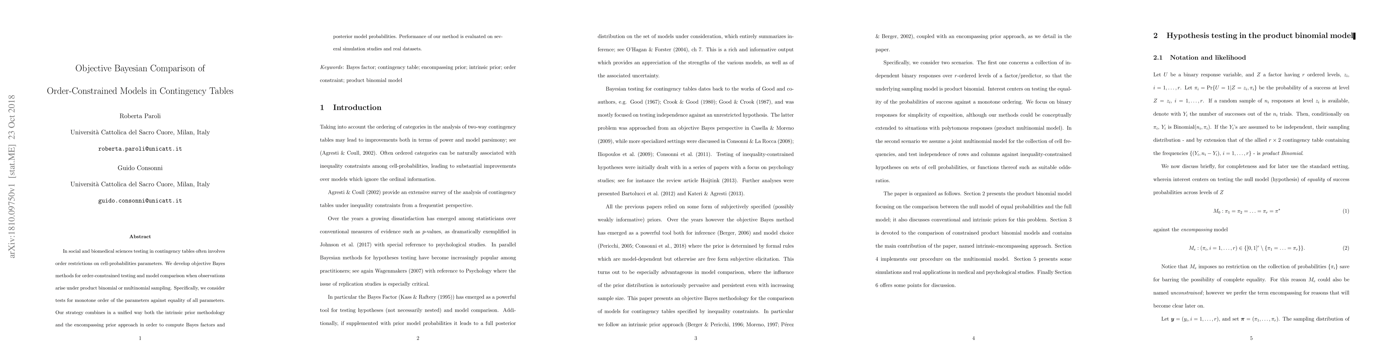 This paper introduces a new method for comparing order-constrained models in contingency tables using objective Bayesian methods, which combines prior methodologies to compute Bayes factors and posterior model probabilities.