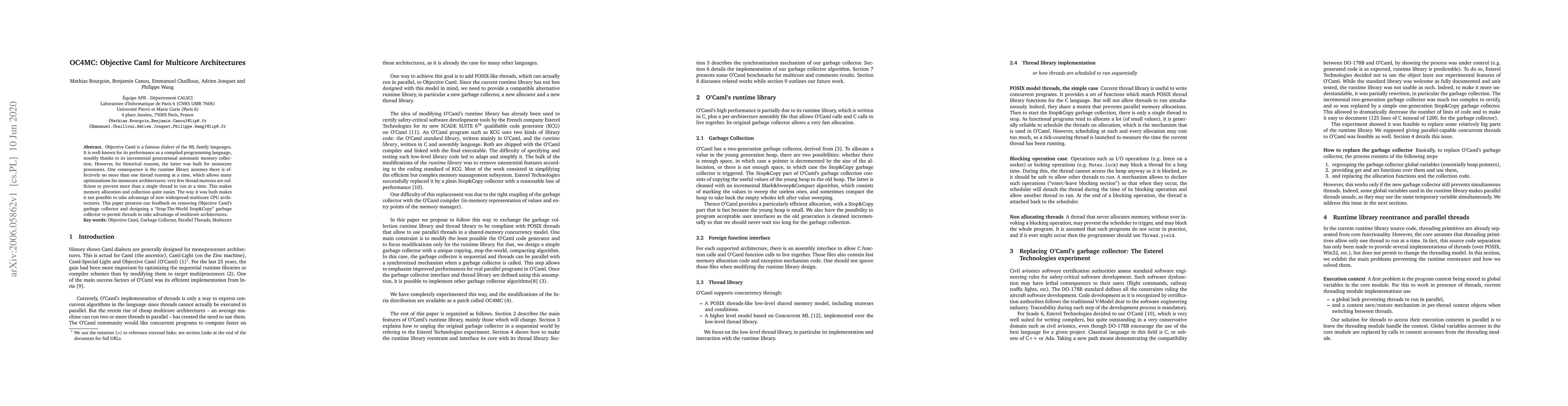 This paper discusses redesigning Objective Caml's memory management system to include a "Stop-The-World Stop&Copy" garbage collector, enabling it to effectively utilize multicore architectures and improve performance beyond its current monocore optimizations.