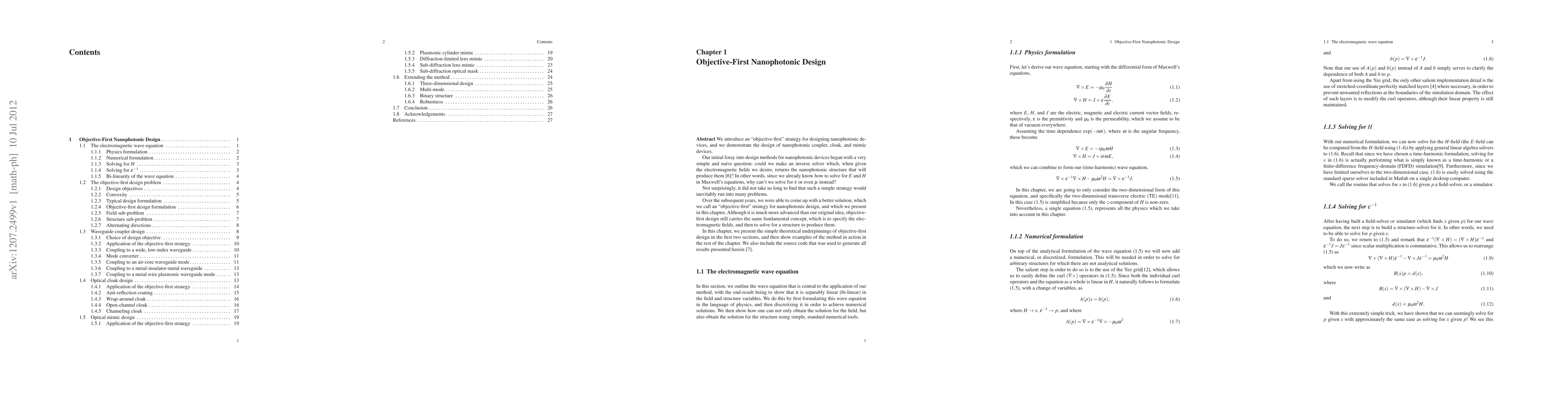 We introduce an "objective-first" strategy for designing nanophotonic devices, and we demonstrate the design of nanophotonic coupler, cloak, and mimic devices.
