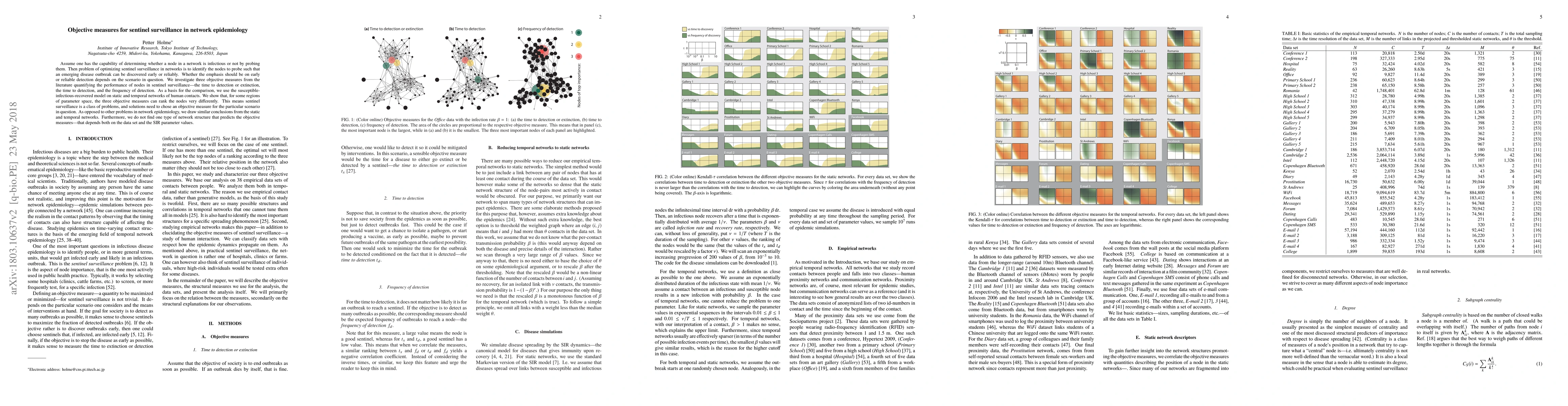 This paper investigates objective measures for optimizing sentinel surveillance in network epidemiology, comparing three measures: time to detection or extinction, time to detection, and frequency of detection. It concludes that the choice of measure significantly impacts node ranking, emphasizing the need for scenario-specific solutions.