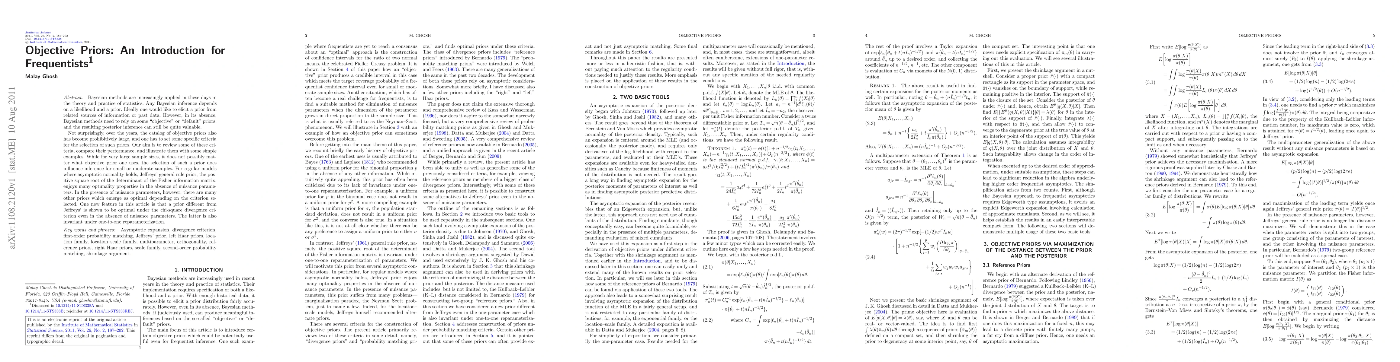 This paper reviews various objective priors used in Bayesian inference, comparing their performance and criteria for selection. It highlights Jeffreys' prior's optimality in regular models but notes that different priors can be optimal under different criteria, even in the absence of nuisance parameters.