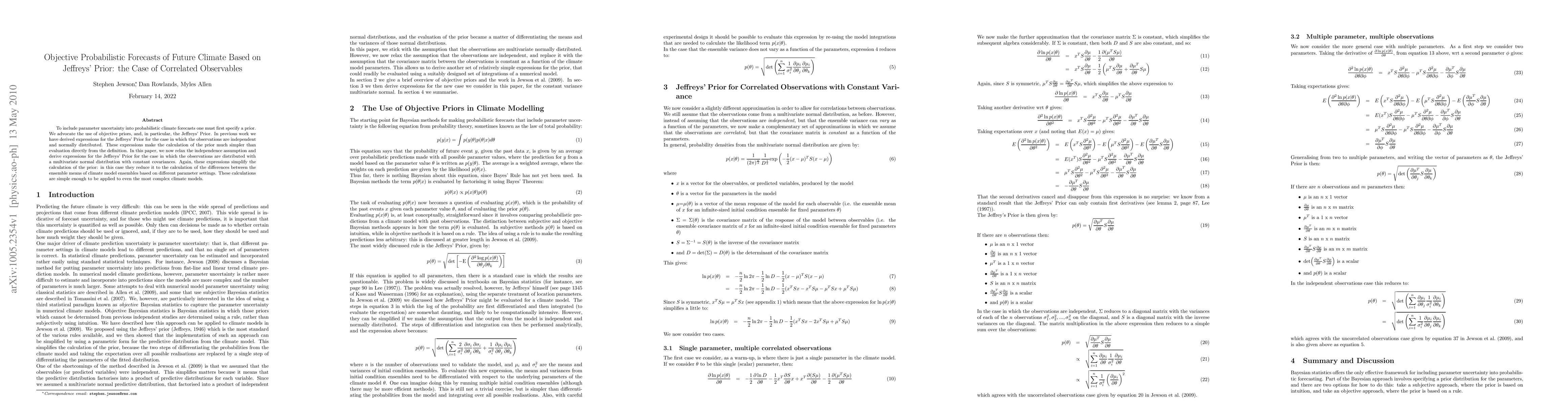 To include parameter uncertainty into probabilistic climate forecasts one must first specify a prior. We advocate the use of objective priors, and, in particular, the Jeffreys' Prior. In previous work we have derived expressions for the Jeffreys' Prior for the case in which the observations are independent and normally distributed. These expressions make the calculation of the prior much simpler than evaluation directly from the definition. In this paper, we now relax the independence assumption and derive expressions for the Jeffreys' Prior for the case in which the observations are distributed with a multivariate normal distribution with constant covariances. Again, these expressions simplify the calculation of the prior: in this case they reduce it to the calculation of the differences between the ensemble means of climate model ensembles based on different parameter settings. These calculations are simple enough to be applied to even the most complex climate models.