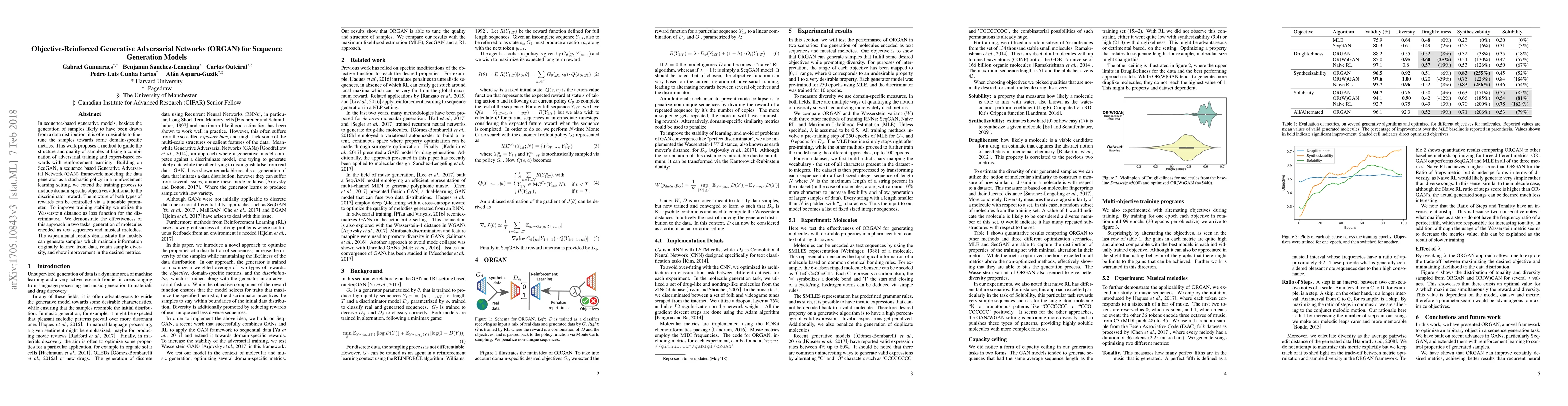 Objective-Reinforced Generative Adversarial Networks (ORGAN) combine GANs and reinforcement learning to bias sequence generation towards desirable metrics while maintaining data fidelity. This method is tested for generating text-encoded molecules and music, demonstrating effective metric-oriented generation.