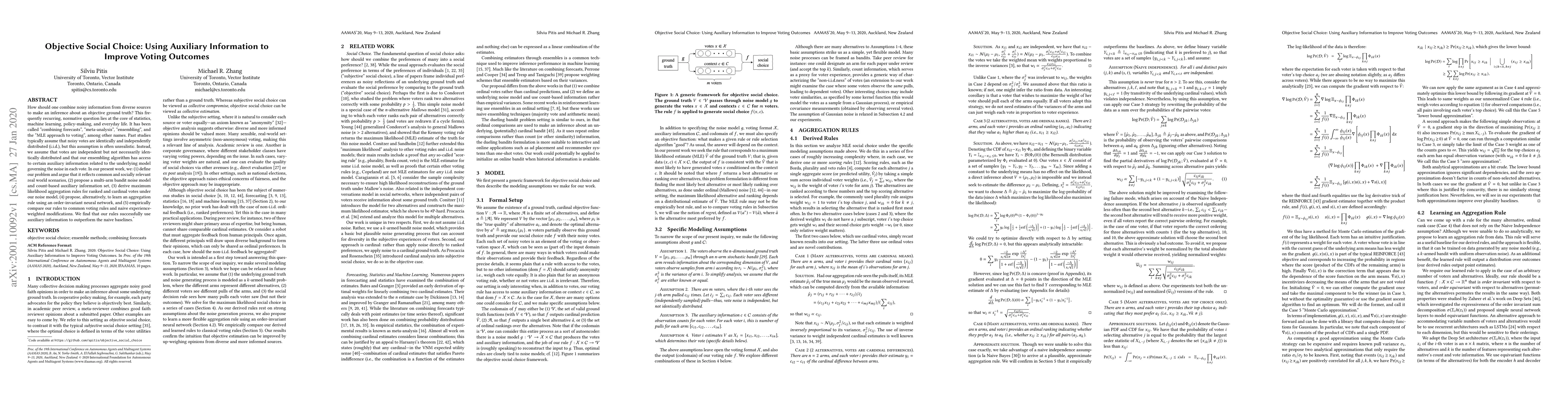How should one combine noisy information from diverse sources to make an inference about an objective ground truth? This frequently recurring, normative question lies at the core of statistics, machine learning, policy-making, and everyday life. It has been called "combining forecasts", "meta-analysis", "ensembling", and the "MLE approach to voting", among other names. Past studies typically assume that noisy votes are identically and independently distributed (i.i.d.), but this assumption is often unrealistic. Instead, we assume that votes are independent but not necessarily identically distributed and that our ensembling algorithm has access to certain auxiliary information related to the underlying model governing the noise in each vote. In our present work, we: (1) define our problem and argue that it reflects common and socially relevant real world scenarios, (2) propose a multi-arm bandit noise model and count-based auxiliary information set, (3) derive maximum likelihood aggregation rules for ranked and cardinal votes under our noise model, (4) propose, alternatively, to learn an aggregation rule using an order-invariant neural network, and (5) empirically compare our rules to common voting rules and naive experience-weighted modifications. We find that our rules successfully use auxiliary information to outperform the naive baselines.