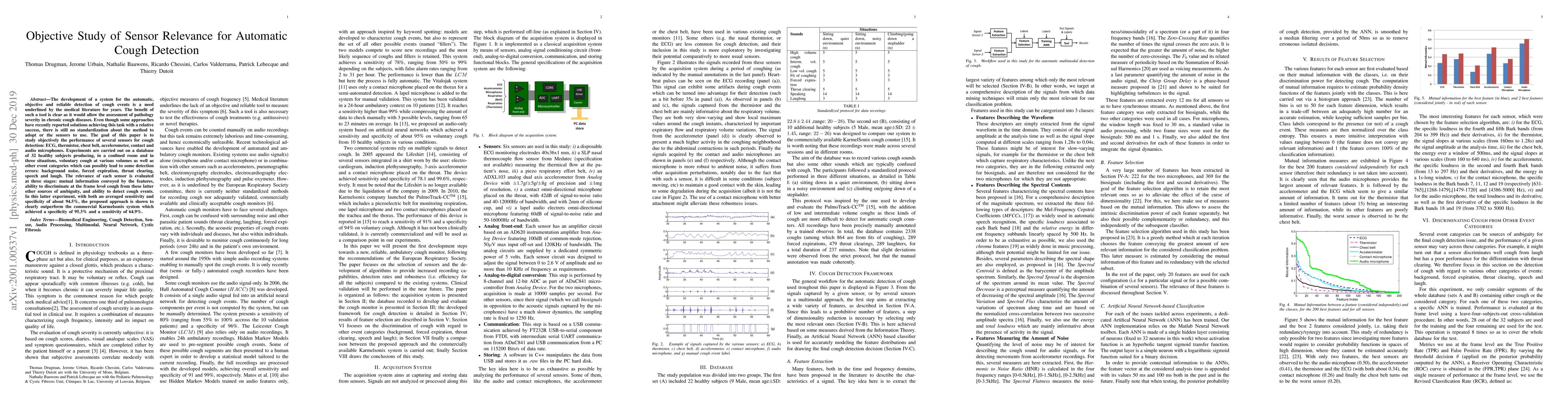This paper evaluates the performance of various sensors—ECG, thermistor, chest belt, accelerometer, contact, and audio microphones—for automatic cough detection. The study demonstrates superior detection accuracy (94.5% sensitivity and specificity) compared to the commercial Karmelsonix system, highlighting the potential for improved chronic cough disease assessment.