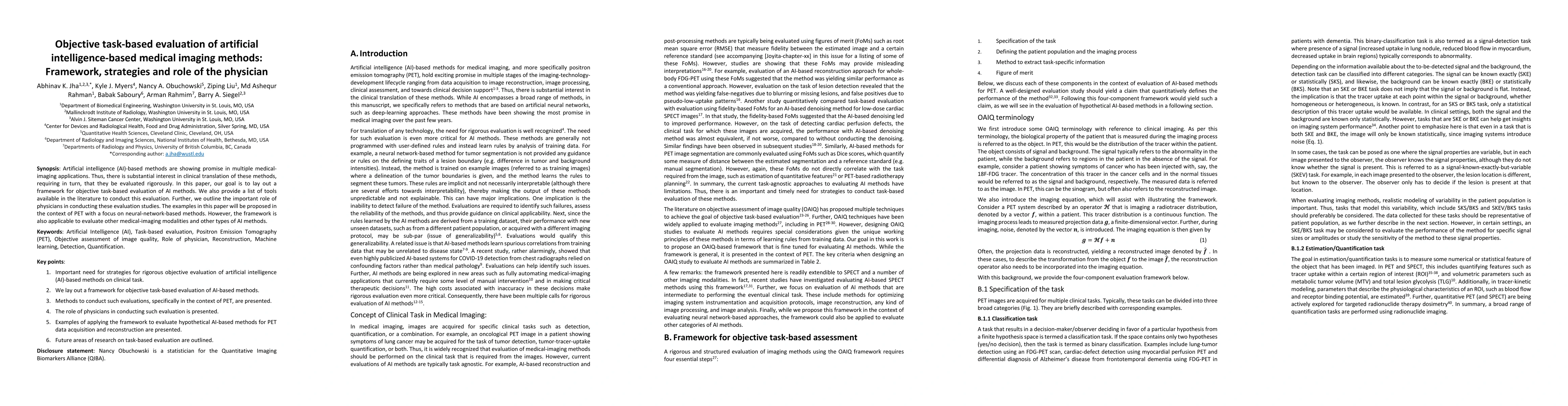 Artificial intelligence (AI)-based methods are showing promise in multiple medical-imaging applications. Thus, there is substantial interest in clinical translation of these methods, requiring in turn, that they be evaluated rigorously. In this paper, our goal is to lay out a framework for objective task-based evaluation of AI methods. We will also provide a list of tools available in the literature to conduct this evaluation. Further, we outline the important role of physicians in conducting these evaluation studies. The examples in this paper will be proposed in the context of PET with a focus on neural-network-based methods. However, the framework is also applicable to evaluate other medical-imaging modalities and other types of AI methods.
