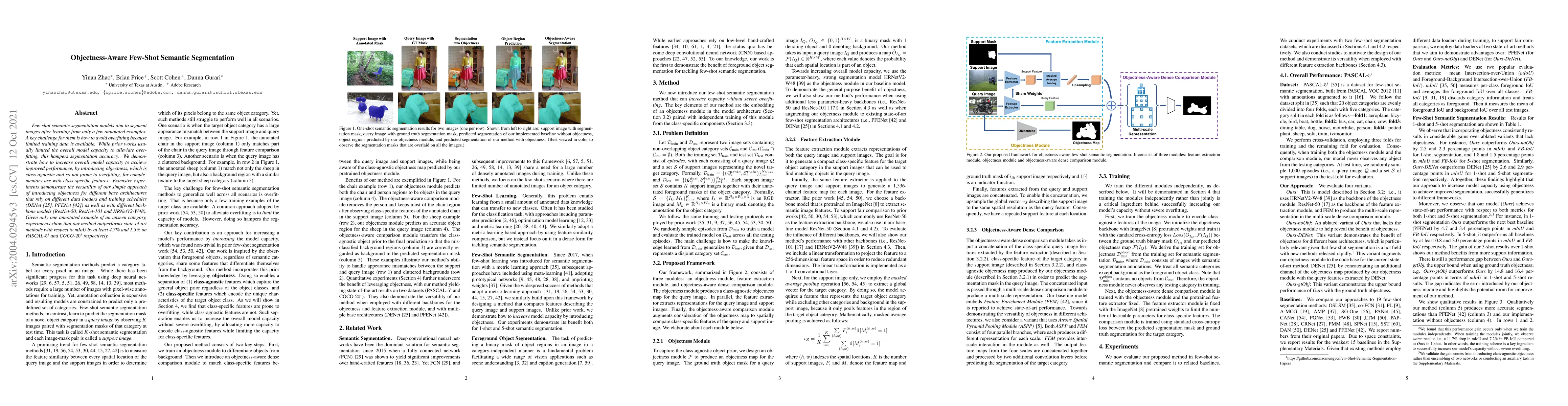Objectness-aware few-shot semantic segmentation models achieve improved performance by incorporating class-agnostic objectness features to reduce overfitting, outperforming state-of-the-art methods with significant margins.