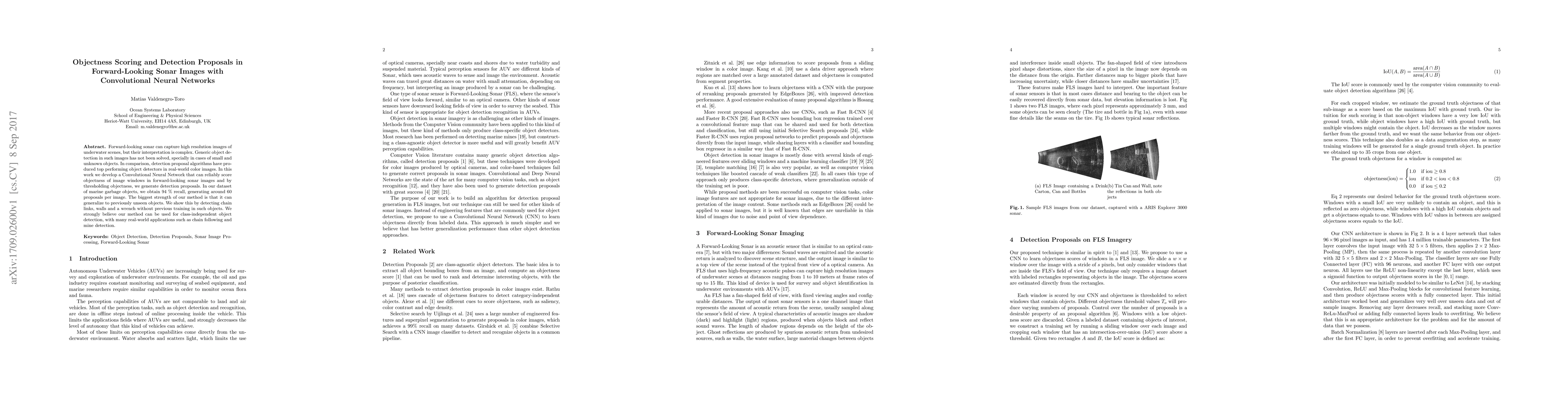 This paper proposes a Convolutional Neural Network for generating detection proposals in forward-looking sonar images, achieving 94% recall for marine garbage objects. The method generalizes to previously unseen objects, demonstrating potential for class-independent detection in applications like chain following and mine detection.